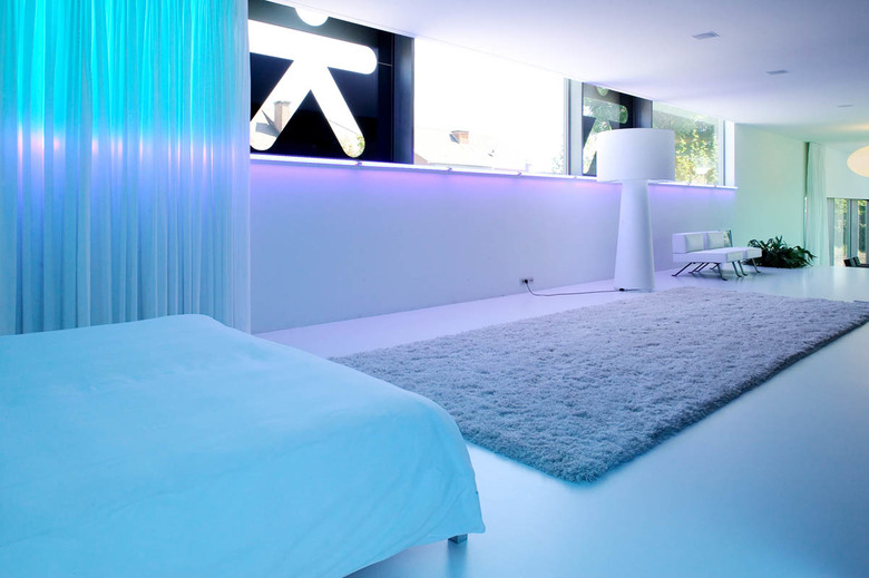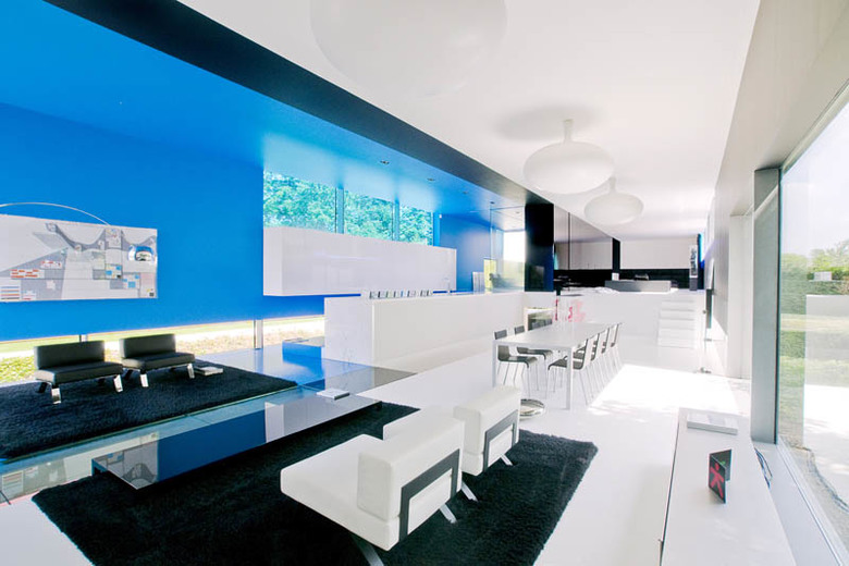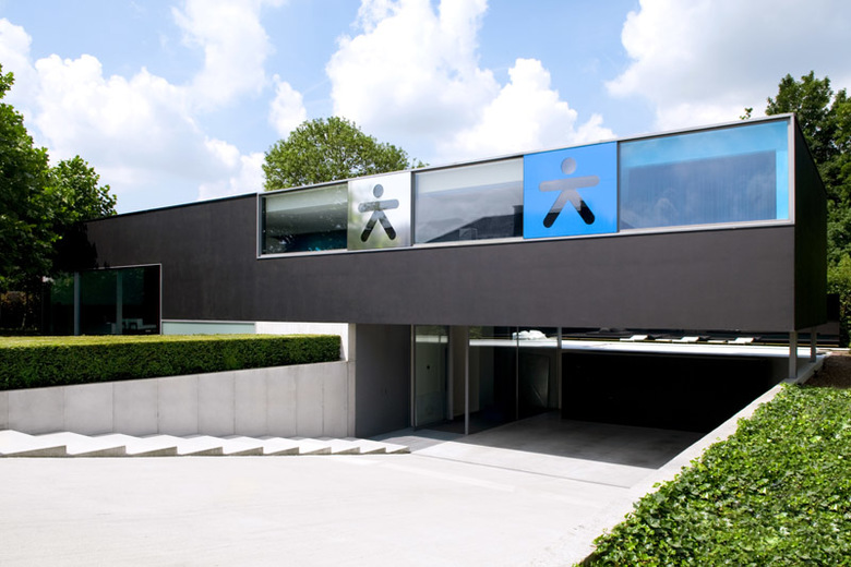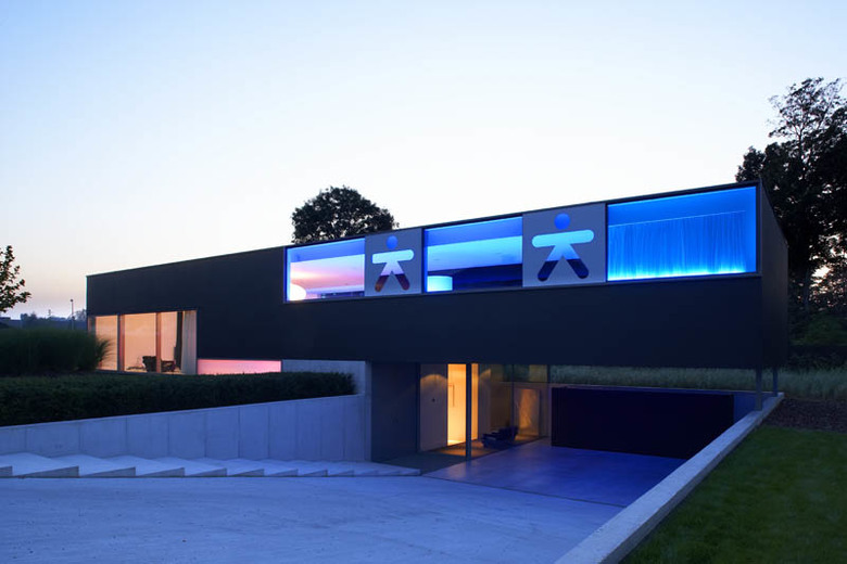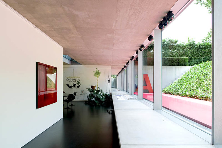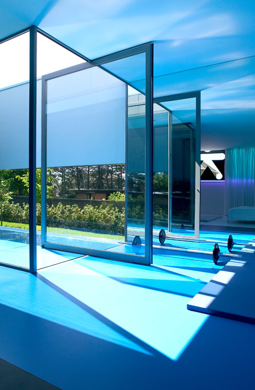 A backyard used in 1973 for a housing experiment (the home of Lode Janssens) now serves a different purpose. Lofts are usually empty boxes in the city without any individual packaging; residential spaces of this kind can, however, be translated conceptually as autonomous volumes with an architectural shell. Luc Binst’s home is a sculptural synthesis of his own creative tools and of interpretations regarding the flexibility of the loft unit. The living level forms a spacious experimental whole, with maximum transparency and visual contact between the different functions. Contemporary use of materials and sophisticated details symbolize the identity intended to promote the loft unit or lounge box as an alternative residential concept. A black-cemented finish for a concrete wall, with steel fins as a bearing structure, heightens the power and dynamism of this streamlined construction. Six years and a series of dwellings later, the sophisticated housing concept with three types of tinted glass (black, gold and mirrored) that has been achieved in Berchem engages in a dialogue with the loft unit in Humbeek.