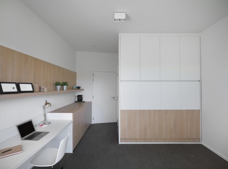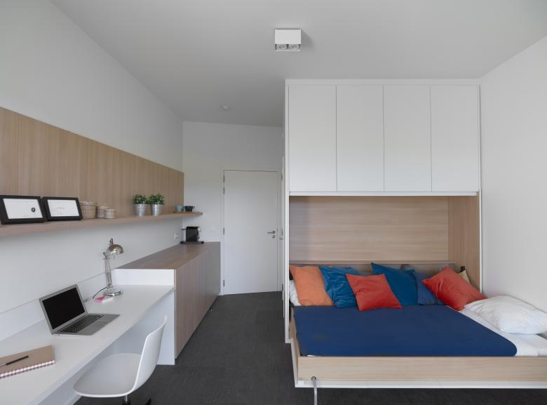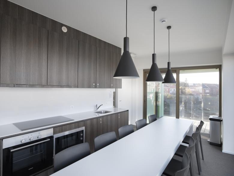 On each floor there are about twenty high-quality student rooms, a total of 157, and at the end of each floor there are communal areas. All windows extend to the floor to draw the surrounding area into the building. The views of the railway, Kessel-Lo, the station area and the forests around Leuven form an alternating background for the students.