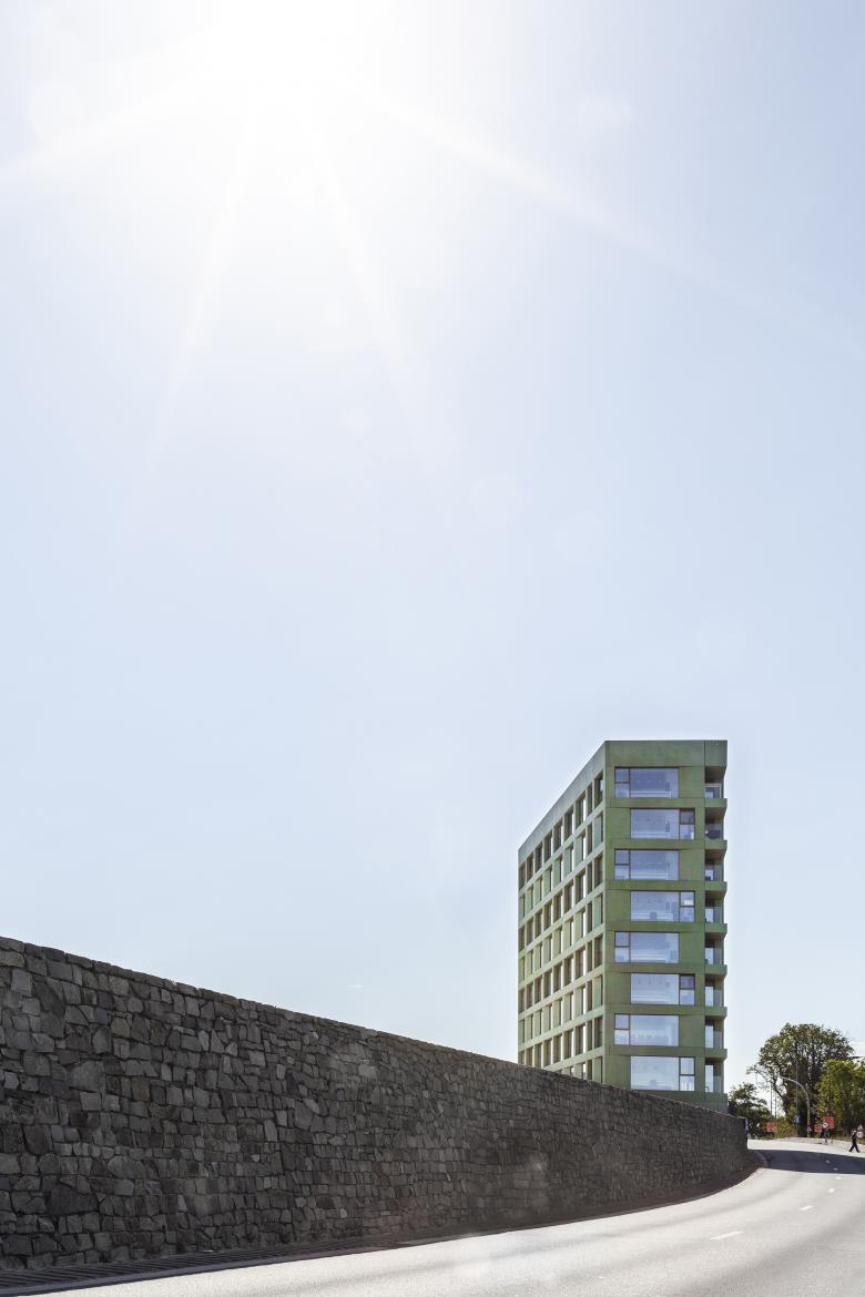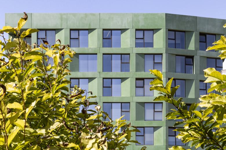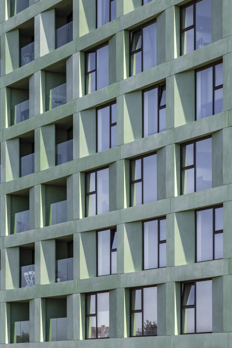 A kink in the building creates an elegant shard shaped volume, to which the rhythmically staggered façade elements add their own playful aspect. Indoor terraces on the railway side add depth to the façade, while large windows at the ends of the buildings open them up. Four façades, each with its own character but connected by the rhythm of the panels. The finely detailed green acidified concrete combines with bronze carpentry to create a stylish whole that matches the green park strip.