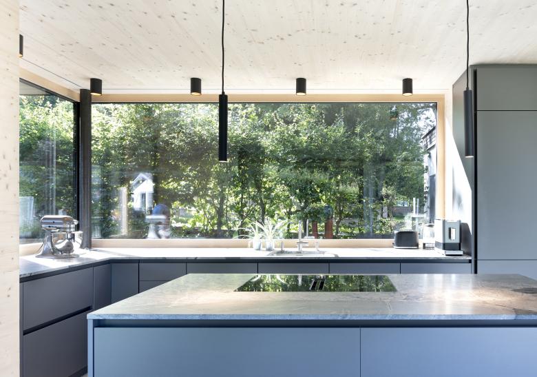 Viel Platz war nicht am kleinen Grundstück. Darum gab es auch nicht so viele Möglichkeiten, das Volumen zu platzieren. Das Haus ist schmal und lang und schmiegt sich an den westlichen Rand. So bleibt der Garten möglichst groß und gleichzeitig der Ausblick möglichst gut. Im Erdgeschoss richtet sich alles nach „innen“, in den Garten. Erst im ersten Stock wechselt das Haus praktisch die Orientierung und richtet sich zum See, über die davor vorbeiführende Straße hinweg. Wie ein Ausguck ist von hier alles zu sehen.