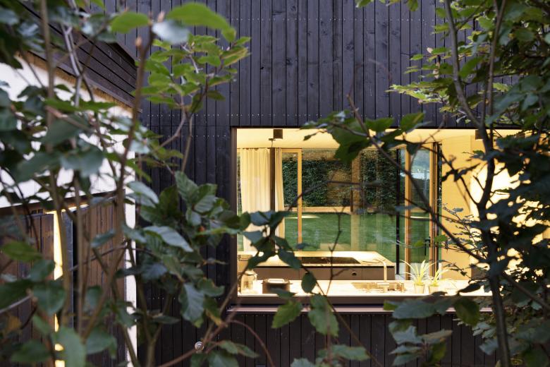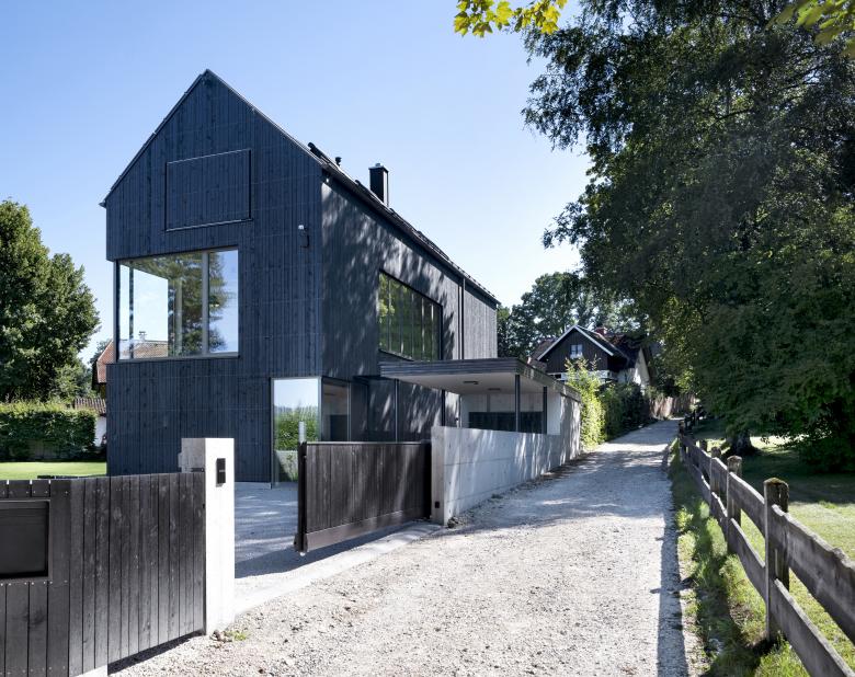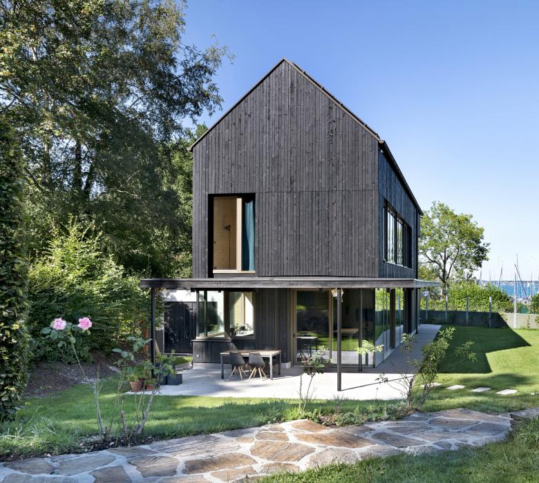 Auch nach außen gibt sich das Haus schlicht. Das Satteldach entspricht der Typologie wie man sie hier findet. Die klare Form des Holzbaus und seine schwarz lasierte Holzfassade nehmen Anleihe an den vielen Bootshäusern rund um den See.