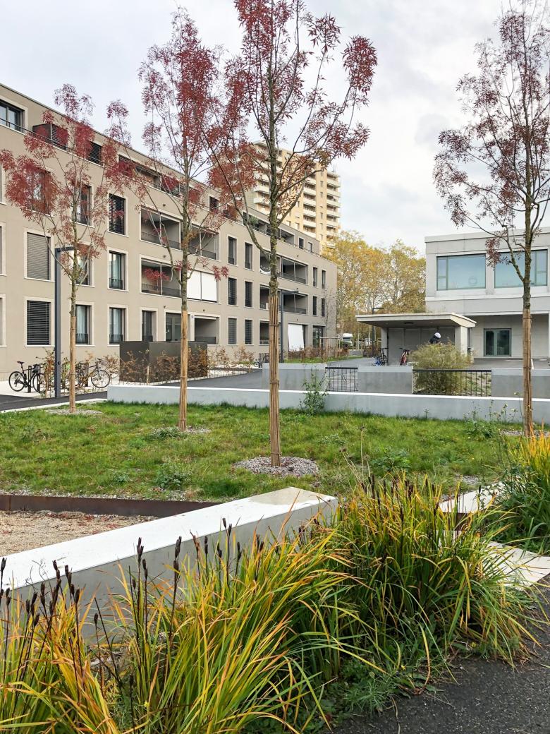 Die grosse, in der Mitte liegende und mit Bäumen bepflanzte Grün- fläche, so wie die daran anschliessenden Wege sind gegenüber dem darumliegenden Grüngürtel um 50 cm abgesenkt. Dieser Grüngürtel bildet einen natürlichen Filter vor der Fassade. Die Abschlussmauern bilden eine umlaufende Sitz-gelegenheit für die in der Mitte liegende Begegnungszone. Die beiden, dreieckigen Plätze südlich und westlich der Wohnbauten sind der Öffentlichkeit zugänglich und als multifunk- tionale Begegnungszonen für das Quartier angelegt.