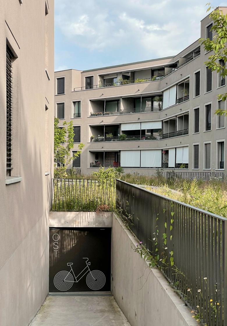 Durch die zentrale Lage nahe dem Bahnhof, auf die Nutzung abgestim- mte Anzahl Autoabstellplätze und die zahlreichen Fahrrad-Abstellplätze konnten die Vorgaben zur Mobilität aus dem Effizienzpfad Energie eingehalten werden.