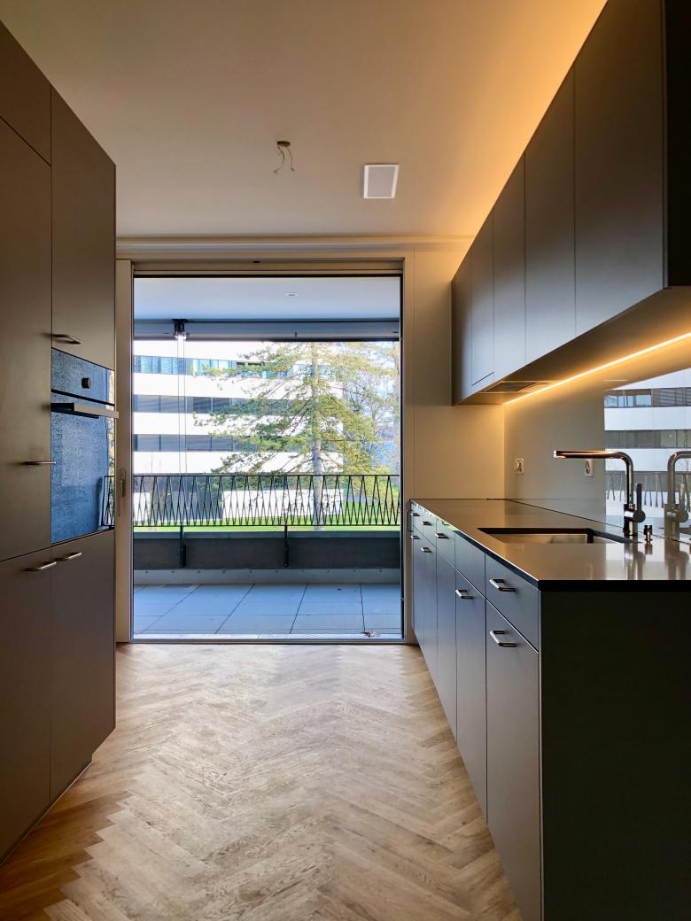 Die realisierte Grundrisstypologie beinhaltet Wohnungen mit einer auf zwei Seiten hin gleichwertigen Orientierung. Dabei hat jedes Wohn- zimmer eine zum Garten und jede Küchen eine zur Strasse hin orien- tierte Loggia. Die durchgängigen Wohn-Essbereiche ermöglichen eine optimale Nutzung des Tageslichtes und bieten damit die Grundlage für helle und lichtdurchflutete Wohnungen.