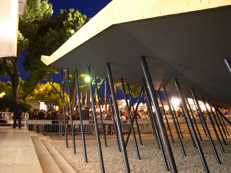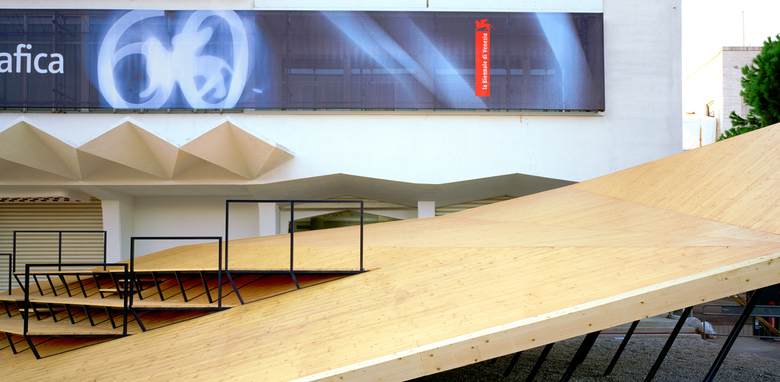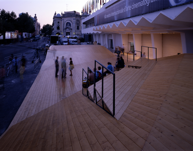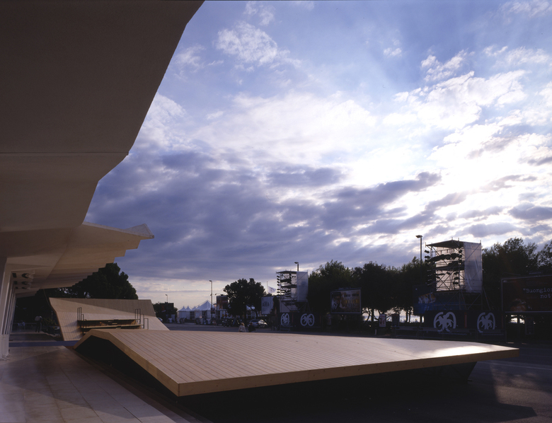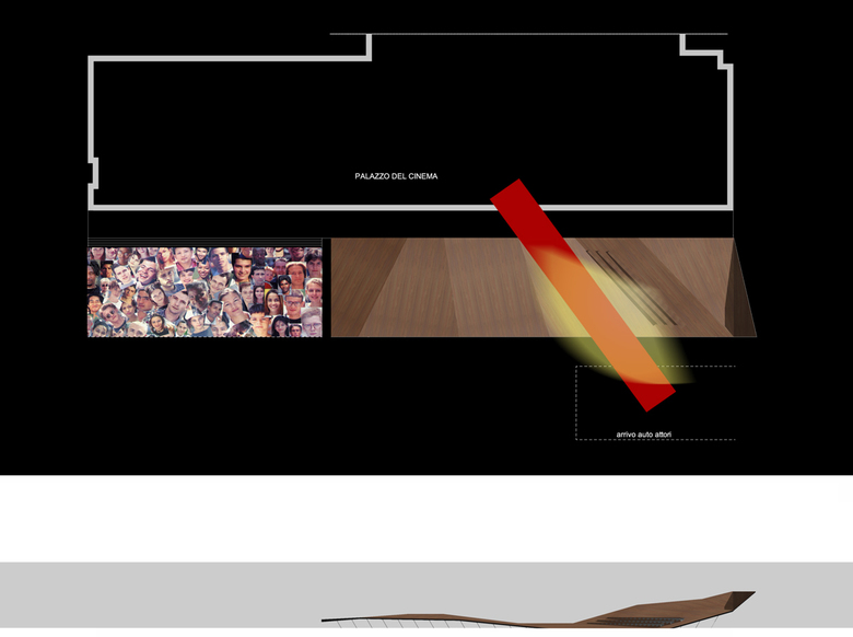 A wave of larch boards supported breaks against the Palazzo del Cinema in the island of Lido in Venice. It impresses a new sign on the venetian scene: a catwalk for the entry of actors and film directors as well as an organised space for photographers. Supported on a serie of steel struts, the wave is a catwalk that keeps the public near and far at the same time. Like the deck of a ship setting sail for a great adventure. The moment of the actors arrival is an explosive and magic one but it last a second as when the wave breaks itself on the beach, leaving a corrugated soil on the threshold between earth and water.