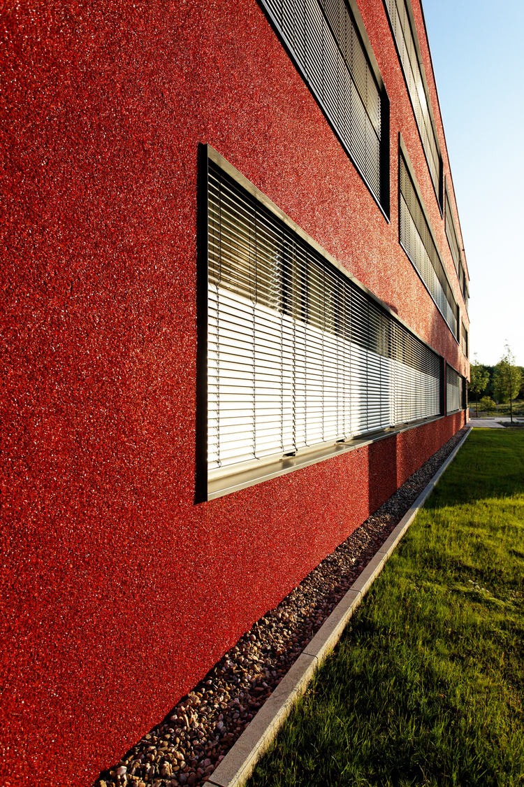 Facade – The external covering of the highly insulated facade exists of a red cladding in which a surcharge of red, broken glass was trained. The glass granulate material allows the cubic body to radiate and glitter in the sun. By this material use the building is integrated harmonically in the site of existing red brick buildings but keeps it´s uniqueness. The facade clothing was applied in this form for the first time with a building project of this scale.
