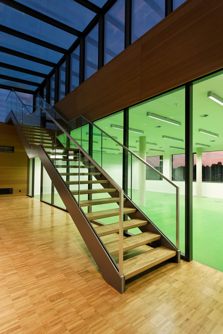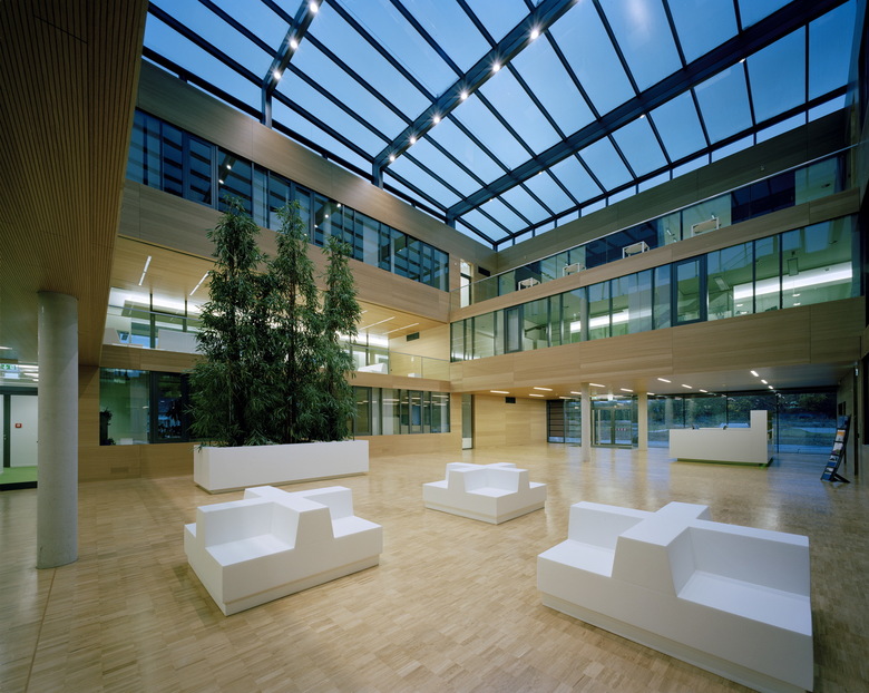 Technical concept – Integral planning component of the house-technical draught is the central atrium which fulfils a determining exhaust air function and allows the exposure of the inside lying workspaces with natural daylight. The supply of the fresh air occurs about a ventilation system in connection with a highly efficient warm recovery. When required the ventilation air is preconditioned about the ground water, the postheating energy is made available by a ground water heat pump. About the guidance of the ventilation air by special aircanals within the concrete ceilings the masses of the construction body are activated and perform thus an essential portion to the space climate. The solar protection occurs about outside positioned solar control louvres with a daylight steering system in the upper third of the hangings. The whole lighting of the building is optimised on your efficiency and is linked up with movement and daylight sensors.