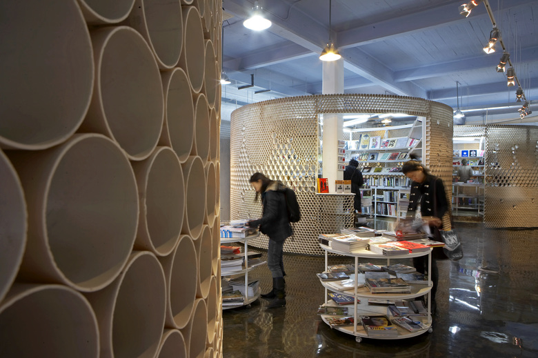 Each book silo contains its own theme: photography, art and design. All of the silos are the same height but are differentiated by their diameters. The first aim was to create transparency within the space. This was achieved by constructi at eye level and 50mm below and above, it is possible to manipulate the experience of transparency. Altogether, approximately 20,000 cross sections of PVC pipe are used. Secondly, by constructing only a general regulation for the building of the structure, the final construction was left to the artisan. The design regulations encouraged experimentation throughout the construction process in order to find the best solution. Therefore, the finished design is also a work in progress, just as in the traditional Chinese construction process where there is an element of trial-and-error.