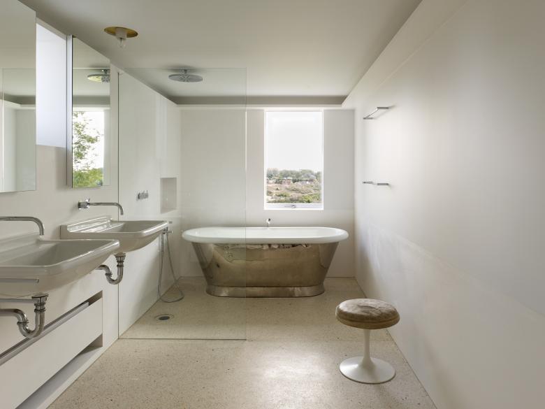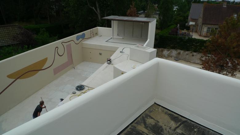 Because of the large staircase, there were two useless rooms on the first floor - too small to even get a bed in there. By installing: a new staircase, a small home elevator, and getting rid of all the walls - the floor could be converted into a master bedroom. To make it autonomous, the top floor of 13 m2 (31m3) was extended with an ensuite bathroom. It is a massive extension as it thickened the existing roof partition wall. The unused roof became a roof terrace - adjacent to the master bedroom - with a beautiful panoramic view over the dunes..