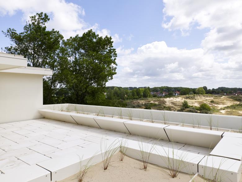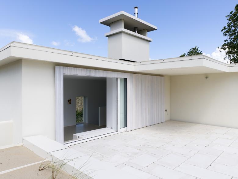 The massive low horizontal walls - with a rounded, solid finishing - are very much in keeping with the architecture of the house, and form a subtle part of the Decorum seen from the dunes, like a bunker remnant.