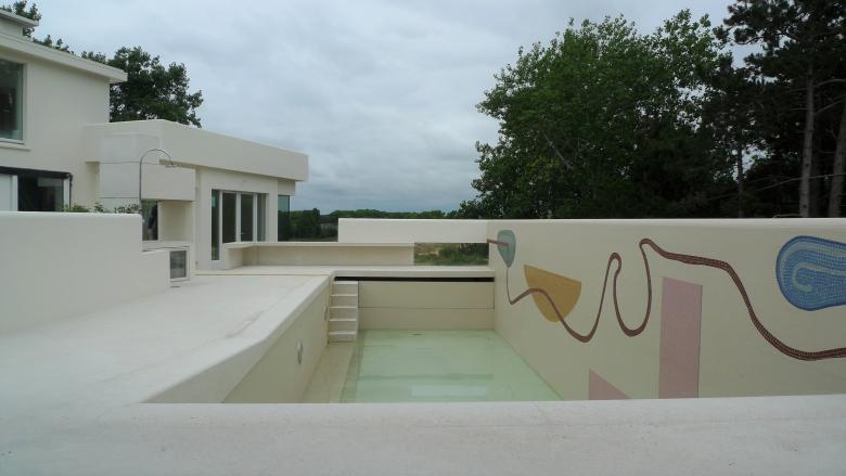 All while trying to preserve the soul of the place, how I experienced it during my first visit. On the inside of the longest wall alongside the pool, an artwork by Philip Y Aguirre has been integrated. A subtle, sensitive picturethat continues underwater. Visible fragmentarily from the main living and sleeping space of the house, invisible to the outside world.