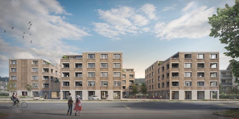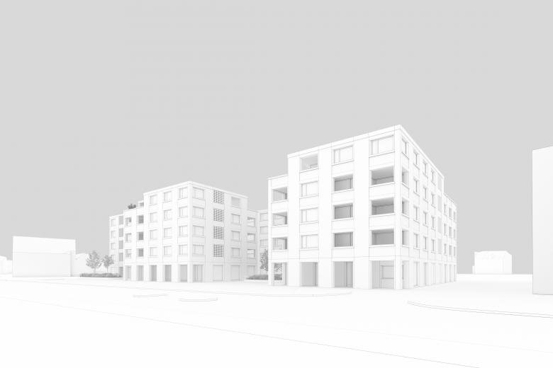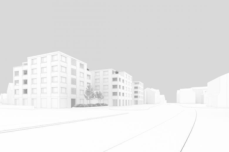 Orthogonal zur Baselstrasse werden drei kleinere und ein grösseres Volumen versetzt zueinander positioniert und mit Zwischenbauten zu einem Ensemble zusammengefasst. Es entstehen spannende und klar definierte Aussenräume. Die Gebäude sind fünfgeschossig. Die kleinteilige Massstäblichkeit der neuen Überbauung fügt sich in die bestehende Struktur des Dorfzentrums von Dagmersellen ein.