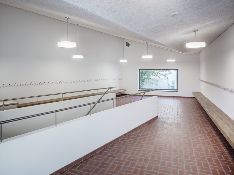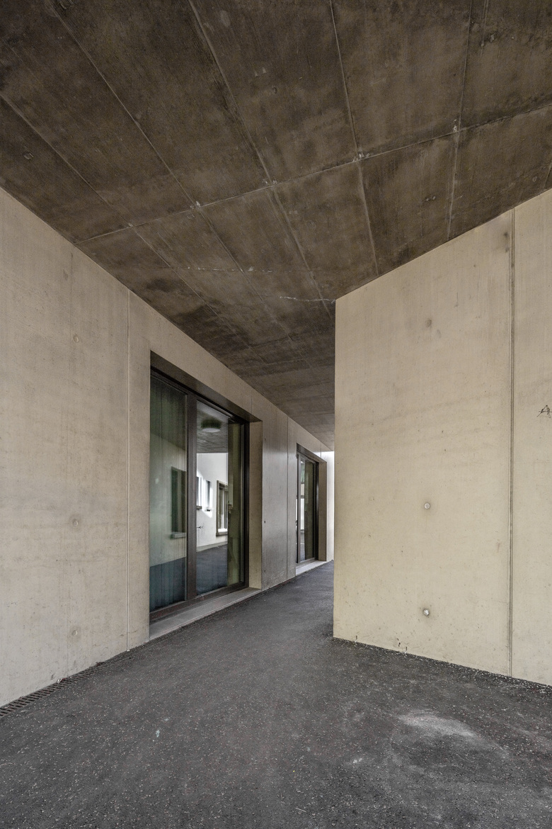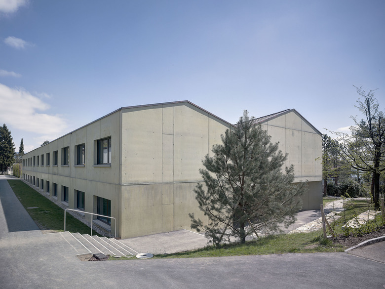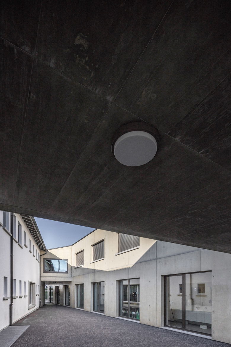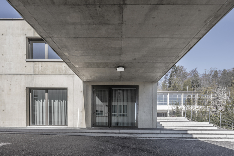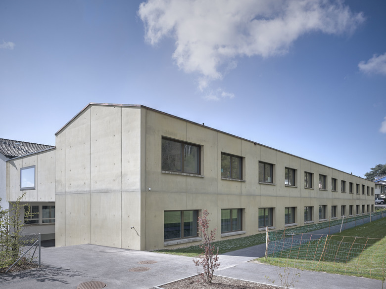 Im Erdgeschoss werden die Tagesschule und der Mehrzweckraum mit den Nebenräumen untergebracht. Die Tagesschule zeichnet sich durch eine offene Raumgestaltung aus, wobei die Räumlichkeiten nach Bedürfnis unterteilt werden können. Die Haupträume haben eine zweiseitige Belichtung, einerseits zum Zwischenhof und andererseits zur nördlichen Spielwiese. Im Obergeschoss sind die Schulzimmer angeordnet. Die Schulräume werden ebenfalls zweiseitig belichtet. Die Gruppenräume sind zweckgemäss zwischen je zwei Klassenzimmern platziert. Diese Gruppierung basiert auf einem klaren Raster. Alle Räume weisen grosse Fensterflächen auf und profitieren dadurch von optimalen Lichtverhältnissen. Die Korridore werden an wichtigen Zirkulationsorten mit grosszügigen, offenen Zonen ergänzt. Die Aufenthalts- und Arbeitsräume der Lehrpersonen werden im bestehenden Gebäude auf der Südostseite untergebracht. Die zentrale Lage neben dem Eingangsbereich gewährleistet kurze Wege, eine gute Übersicht über das Areal und somit einen einfachen Schulbetrieb. Die Fassaden werden mit additiven Lochfenstern mit einer angemessenen Zurückhaltung ausgestaltet. Der Sichtbetonbau übernimmt die bereits vorhandene gelbe Farbe von den nachbarliegenden Schulgebäuden.