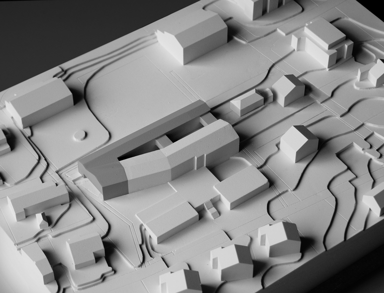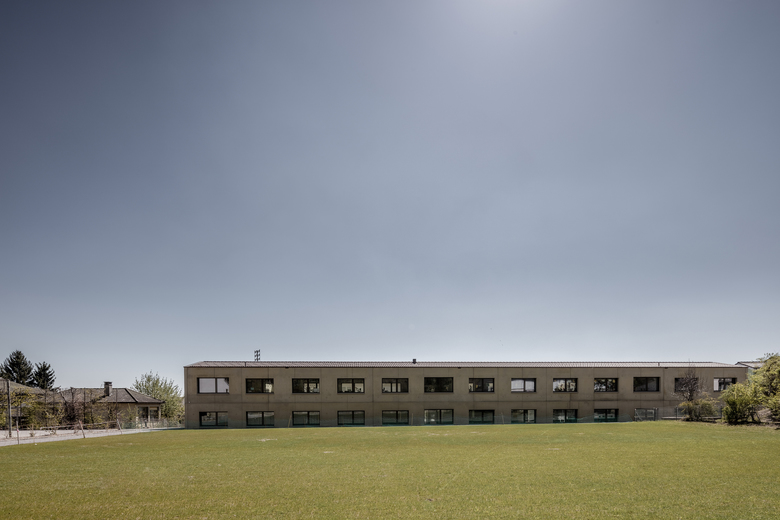 Die städtebauliche Figur bezieht sich stark auf die bestehende Anlage. An das bestehende Schulhaus wird rückseitig ein zweigeschossiges Gebäude mit einer Fuge platziert. Es wird an der schmalsten Stelle mit dem Bestand verbunden. Dadurch entsteht ein länglicher Zwischenhof, welcher ein stimmungsvoller Begegnungs-, Aufenthalts- und Kommunikationsraum für die Schule schafft.