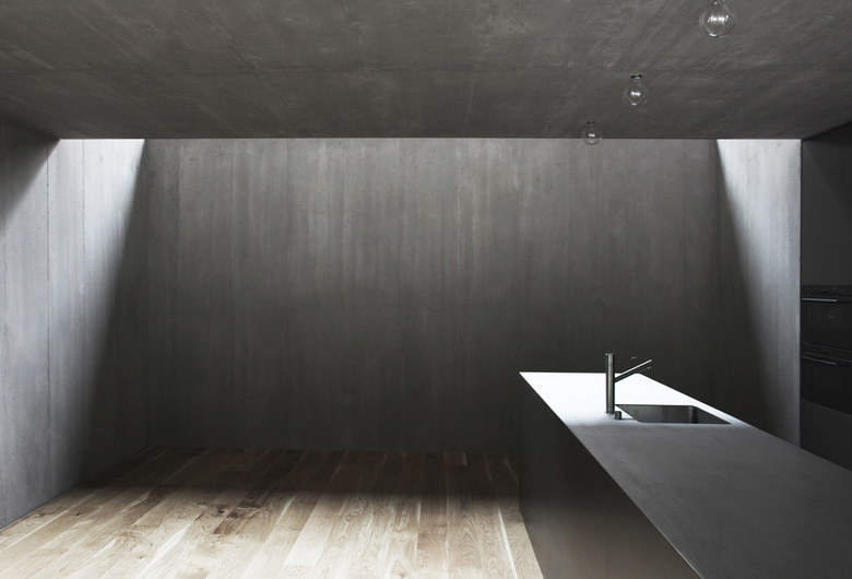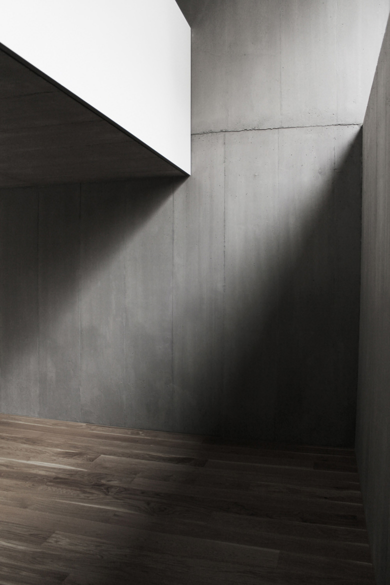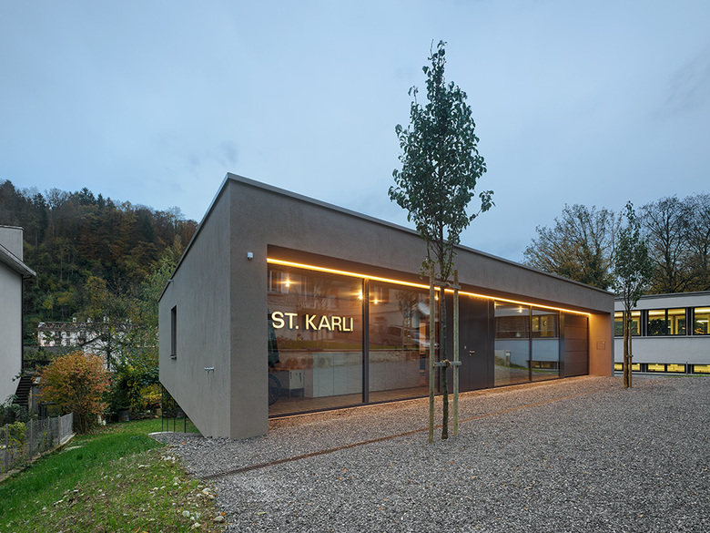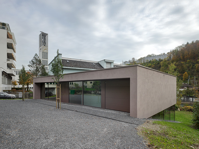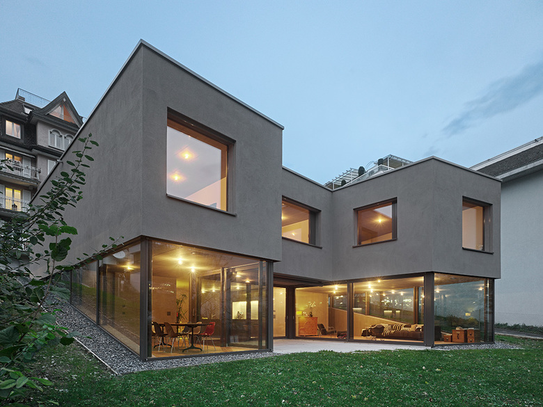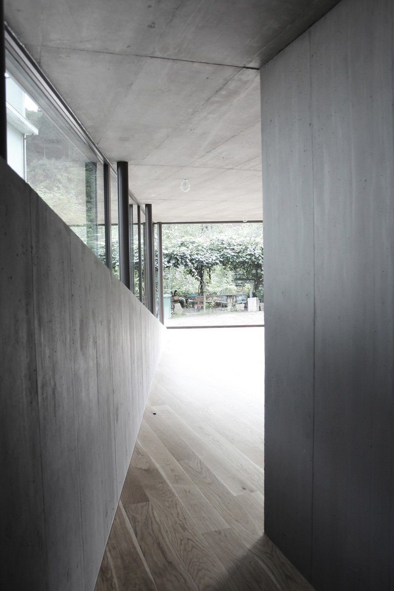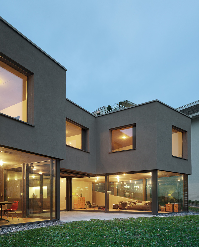 Im massiven Niveau 1 befinden sich die Schlafräume und das Entrée. Im verglasten Niveau 0 sind die Wohnnutzungen untergebracht. Der umliegende Garten wird Teil des Innenraumes, da die schrägen Betonbrüstungen der natürlichen Topografie folgen. Die hangseitigen, tragenden Betonwände werden sowohl im Erdgeschoss wie im Obergeschoss sichtbar gezeigt. Die Bauherrschaft wünschte eine grösstmögliche Flexibilität für die künftige, nachhaltige Nutzung des Gebäudes. So kann das Einfamilienhaus mit wenigen Eingriffen in zwei Geschosswohnungen unterteilt werden.