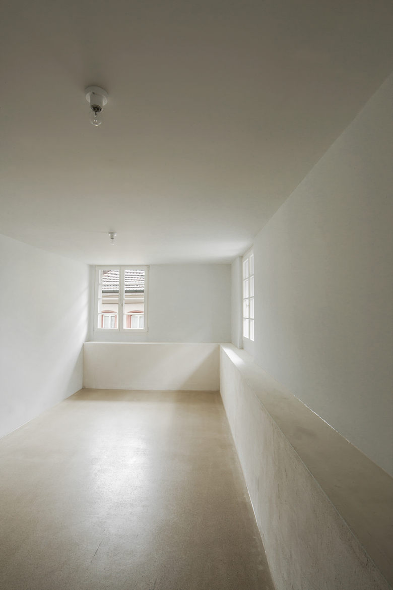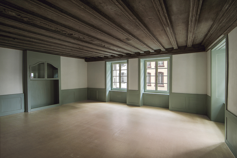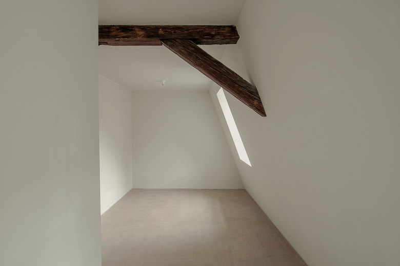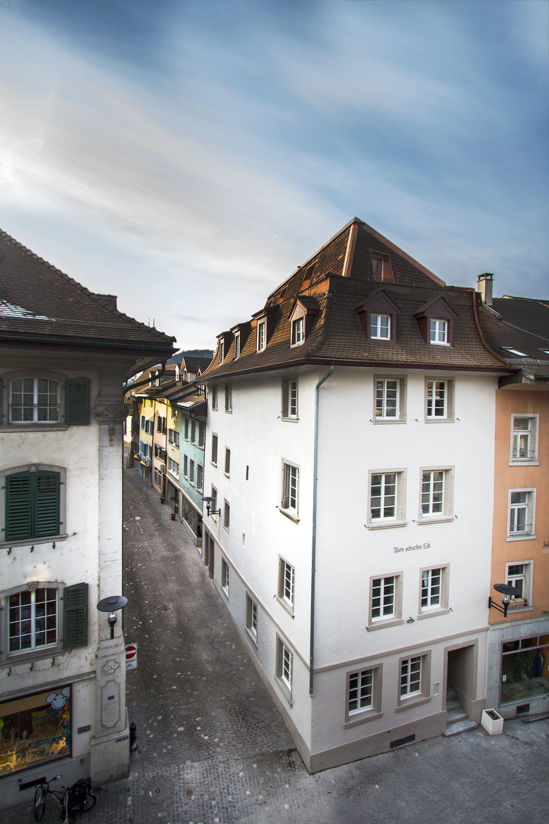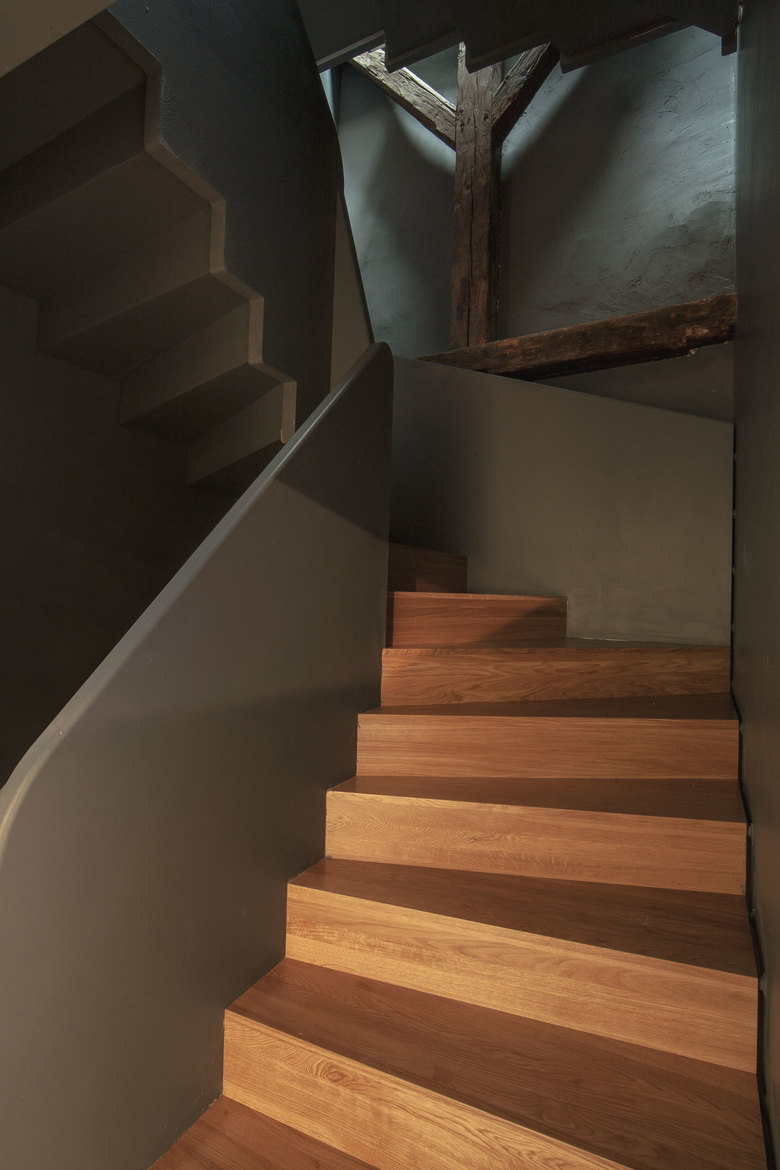 Die Veränderungen am Haus zum Scharfen Eck sind Zeugen der jeweiligen Zeit. Die Überlagerungen der Epochen werden jedoch erst auf den zweiten Blick wahrgenommen. Diesem additiven Weiterbau folgt auch das Konzept von dolmus Architekten. Die Mansardenform wird durch die räumliche Ergänzung verändert. Das Dach wird komplett mit Ziegeln eingedeckt. Aussen erhält das Haus lediglich einen neuen Anstrich. Die Veränderungen konzentrieren sich auf die Innenräume. Nach einer sorgfältigen Rückbauarbeit werden die historisch bedeutenden Bauteile freigelegt. Die stark beschädigte gotische Balkendecke aus dem 15. Jahrhundert sowie die Régence-Stuckdecke von 1739 werden gesichert und sorgfältig saniert. Die originalen Balken und die inneren Riegelwände werden erhalten. Sie werden an den schadhaften Stellen mit nach Möglichkeit sichtbaren Balken ergänzt. Die neuen Einbauten haben eine zurückhaltende Farb- und Formgebung. Sie fügen sich sanft ins Bild ein. Im Treppenhaus treffen die alten Holzstrukturen mit der neuen Eichentreppe gleichwertig aufeinander. Die dunkle Farbgebung unterstützt die Plastizität des Raumes und des Materials. In den Innenräumen prägt der geschliffene Anhydritboden zusammen mit der Holzstruktur und dem Kalkputz die Stimmung. Das Hochparterre wird weiterhin als Gastronomielokal genutzt. Die Farb- und Raumstimmung ist identisch mit dem Obergeschosse. Der Anhydritboden und der Kalkputz sind auch hier stimmungsgebend. Die Einrichtung der Café-Bar folgt dem Bild eines Wohnzimmers. Eine neue „Wohnwand“ streckt sich über die gesamte Innenwandfläche. Darin werden alte Erinnerungsstücke aufbewahrt.