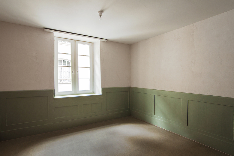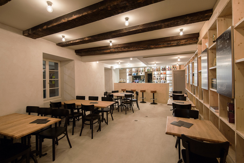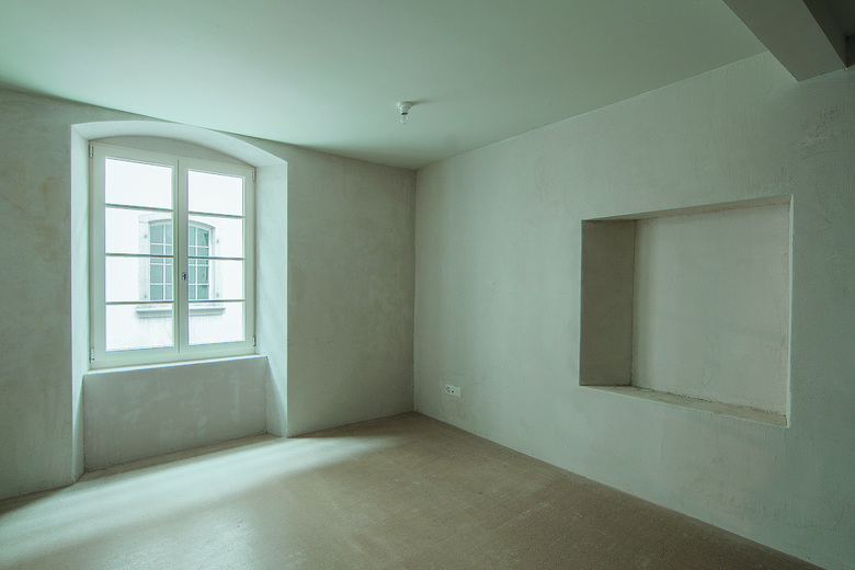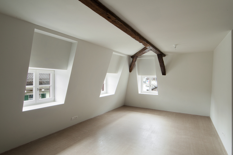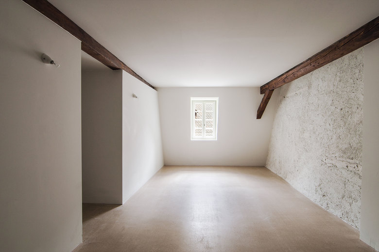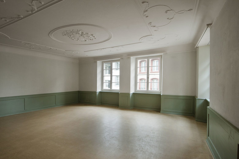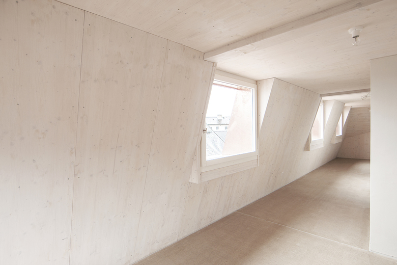 Die Veränderungen am Haus zum Scharfen Eck sind Zeugen der jeweiligen Zeit. Die Überlagerungen der Epochen werden jedoch erst auf den zweiten Blick wahrgenommen. Diesem additiven Weiterbau folgt auch das Konzept von dolmus Architekten. Die Mansardenform wird durch die räumliche Ergänzung verändert. Das Dach wird komplett mit Ziegeln eingedeckt. Aussen erhält das Haus lediglich einen neuen Anstrich. Die Veränderungen konzentrieren sich auf die Innenräume. Nach einer sorgfältigen Rückbauarbeit werden die historisch bedeutenden Bauteile freigelegt. Die stark beschädigte gotische Balkendecke aus dem 15. Jahrhundert sowie die Régence-Stuckdecke von 1739 werden gesichert und sorgfältig saniert. Die originalen Balken und die inneren Riegelwände werden erhalten. Sie werden an den schadhaften Stellen mit nach Möglichkeit sichtbaren Balken ergänzt. Die neuen Einbauten haben eine zurückhaltende Farb- und Formgebung. Sie fügen sich sanft ins Bild ein. Im Treppenhaus treffen die alten Holzstrukturen mit der neuen Eichentreppe gleichwertig aufeinander. Die dunkle Farbgebung unterstützt die Plastizität des Raumes und des Materials. In den Innenräumen prägt der geschliffene Anhydritboden zusammen mit der Holzstruktur und dem Kalkputz die Stimmung. Das Hochparterre wird weiterhin als Gastronomielokal genutzt. Die Farb- und Raumstimmung ist identisch mit dem Obergeschosse. Der Anhydritboden und der Kalkputz sind auch hier stimmungsgebend. Die Einrichtung der Café-Bar folgt dem Bild eines Wohnzimmers. Eine neue „Wohnwand“ streckt sich über die gesamte Innenwandfläche. Darin werden alte Erinnerungsstücke aufbewahrt.