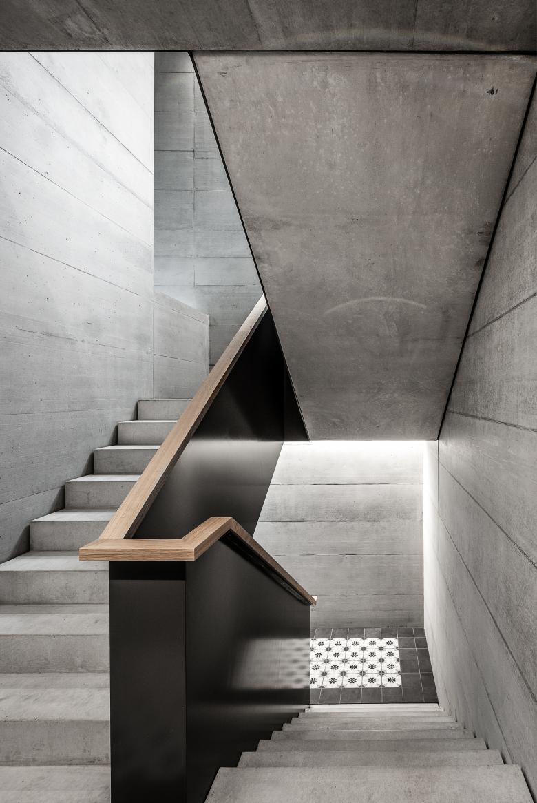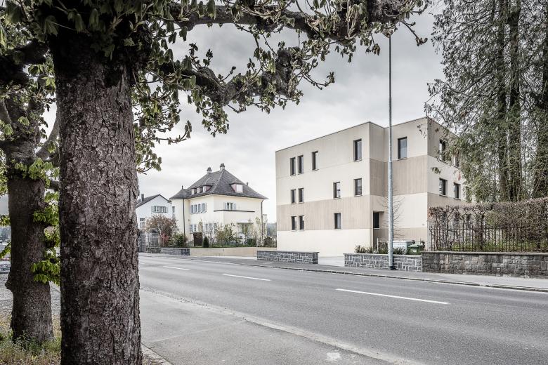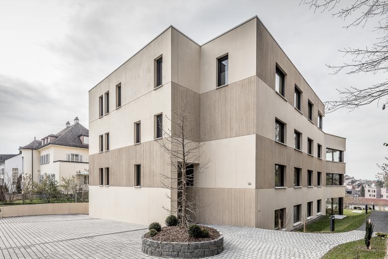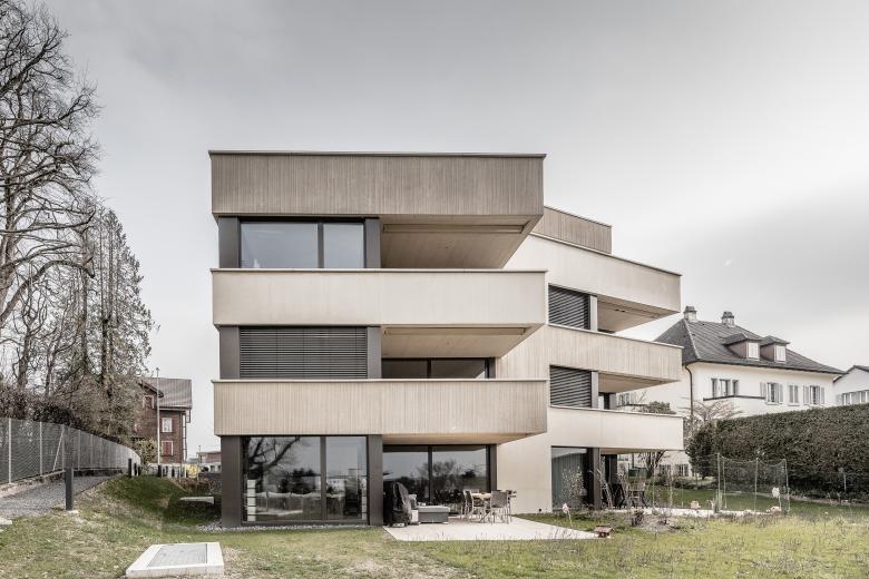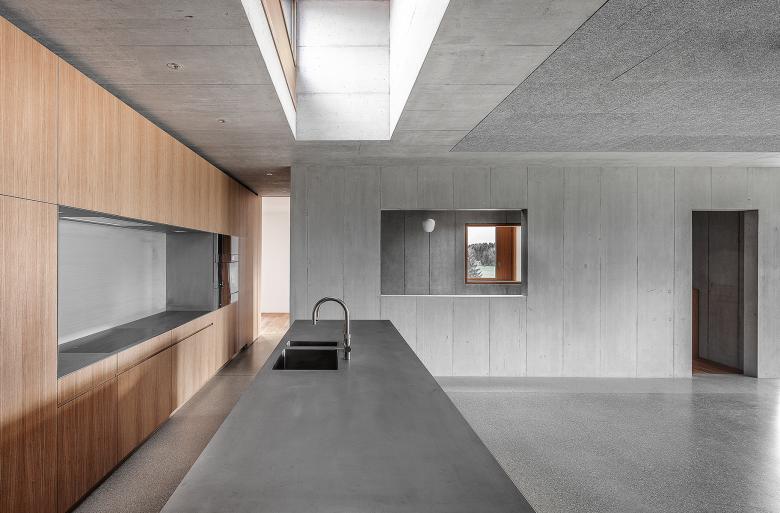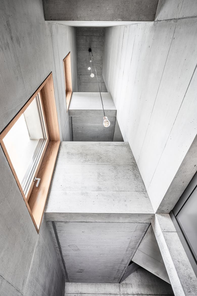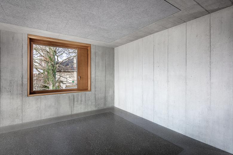 Als Antwort auf die Umgebungseinflüsse bildet das Gebäude eine klare Vorder- und Rückseite. Die Fassade grenzt mit minimierter Fläche geschlossen an die Strasse und fächert sich durch die Abwinklungen zur Südseite auf. Dadurch wird ein möglichst grosser Bezug zur Aussicht generiert. Der Innenraum zeichnet sich durch geschlossene und offene Bereiche aus, die zu einer freieren Raumabfolge und unterschiedlichsten Sichtbezügen führen.