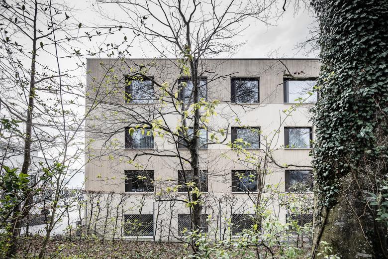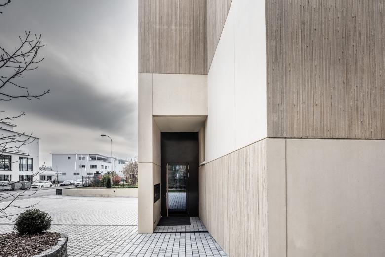 Die Materialisierung erfolgt in sichtbarem Kalkbeton, welcher die Fassade durch variierende Oberflächenbehandlungen gliedert. Sowohl die glatte Sichtbetonschalung als auch die vertikalen Matrizen integrieren sich in das gebaute Umfeld.