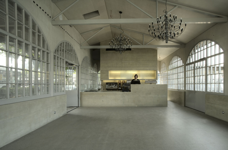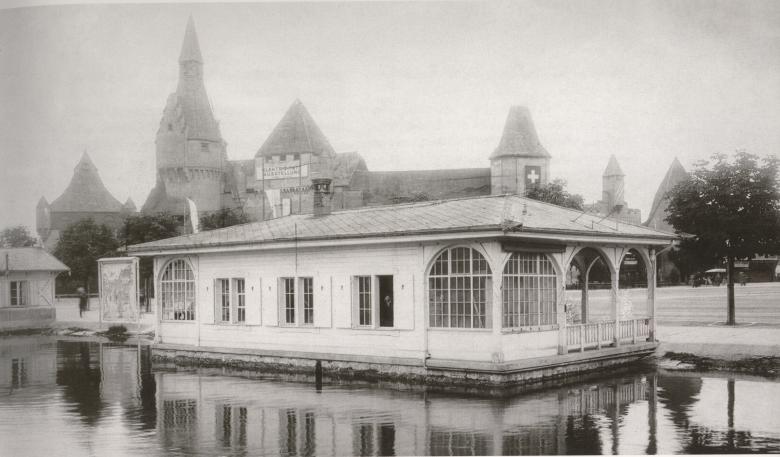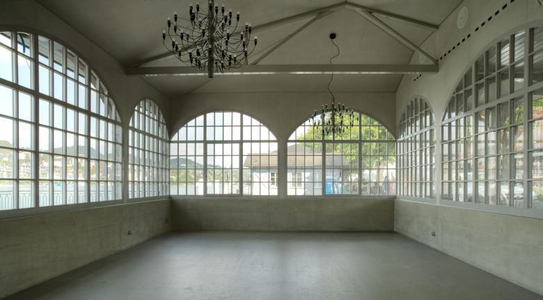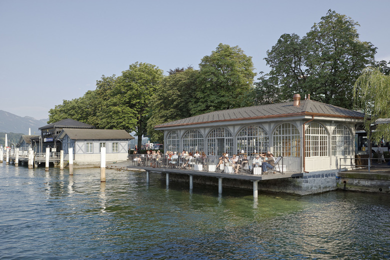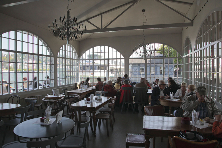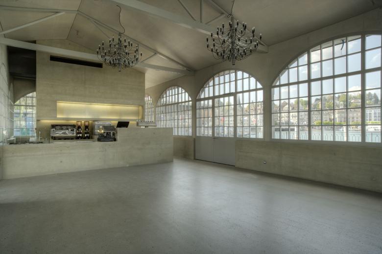 Die ARGE dolmus & Jäger-Egli Architekten ergänzten die alte Holzstruktur und die historischen Fenster mit einer neu interpretierten Fassade. In die leichte Gebäudehülle wurde ein harter Betonkern gesetzt, um das Gebäude auszusteifen. Der Betonkörper beinhaltet die Küche und die Essensausgabe, die Toiletten, sowie die ganze Haustechnik. So erfüllt der Betonkörper mit der Bodenplatte und den Betonbrüstungen die Hochwasserschutzanforderungen. Der Gästebereich besteht aus einer Kombination von Stühlen und Tischen alter Schiffe und neuen Möbeln.