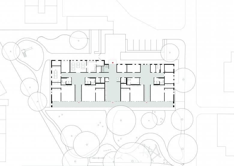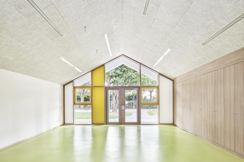 Die Südfassade öffnet sich spielerisch dem von Bäumen gerahmten Außenraum und stellt einen direkten Bezug zu jedem Gruppenraum her. Die Dachneigungen sind auch innerhalb des Gebäudes erlebbar und strukturieren den Baukörper auf eine subtile Art. Die bewusst reduzierte farbliche Gestaltung bietet Platz für kindliche Kreativität und schafft gleichzeitig einen Wiedererkennungswert. Die großzügigen Gruppenvorräume profitieren von der Durchlässigkeit der Südfassade und werden so zu einem freundlichen Ort der Begegnung.