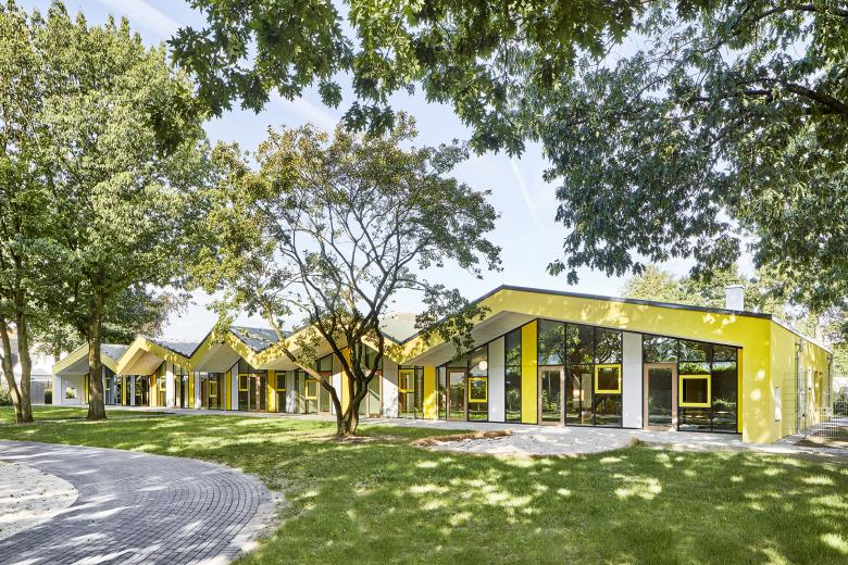 Der Neubau bietet Platz für 82 Ein- bis Sechsjährige, die in vier Gruppen betreut werden und lehnt sich an den ehemaligen langestreckten Bestandsbau an, sodass ein Großteil des vorhandenen Baumbestandes erhalten wurde.