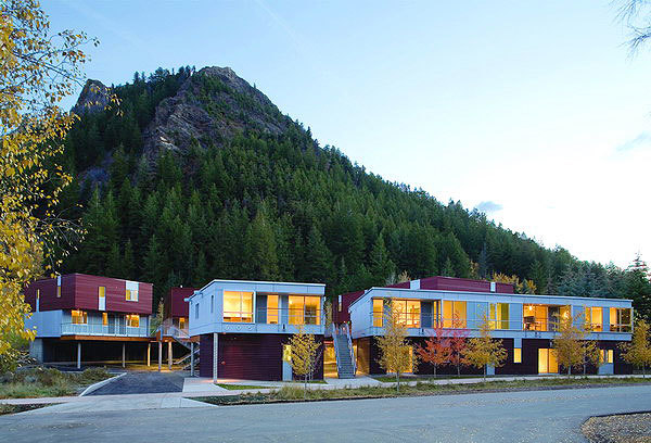 The design negotiates a steep, difficult site and transforms it into a dense, dynamic family complex complete with 14-three bedroom units, 25 covered parking spaces, an open space parcel and a network of public trail easements. The site for this project was an unwanted brown field site which was considered difficult to develop due to its steep elevation, the presence of mine waste rock and rock shafts as well as potential rock fall from above. A partnership was formed with the City of Aspen, which subsidized the project.