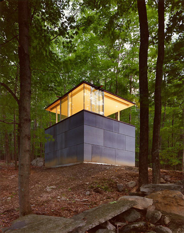 The structure expresses this dual character, with the floating roof cantilevered off the second floor to highlight the distinction between the solid and the void. The windows (standard-issue sliding doors) open on all four sides, stacking in opposite corners, to create the feeling of an aerie in the woods. The changing seasons provide the context, with the study "walls" green in the summer, orange in the fall, and white in the winter. An economy of means in cost, materials, and structure result in simplicity and directness with no elaboration. The study is a serene and solitary haven for quiet work that is at the same time immersed in the natural world around it.