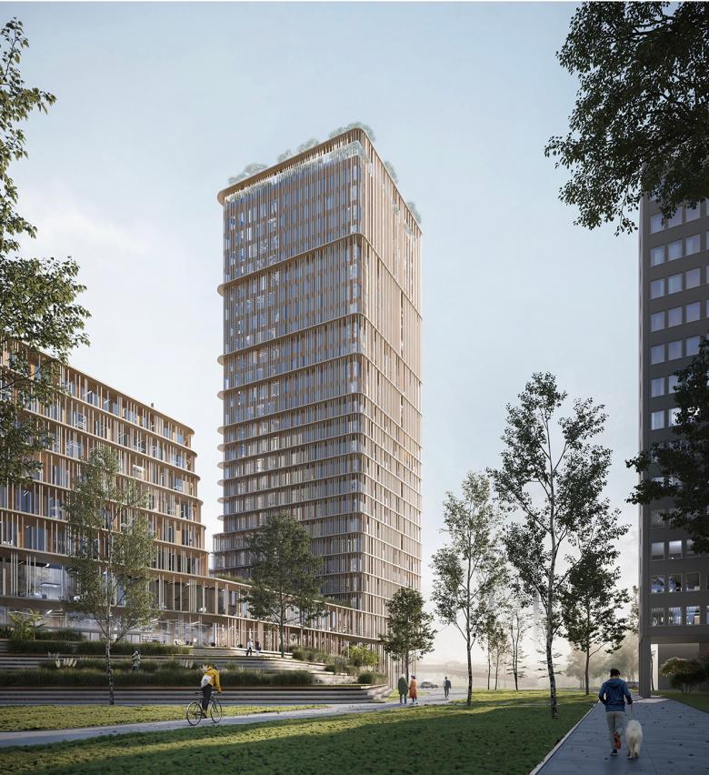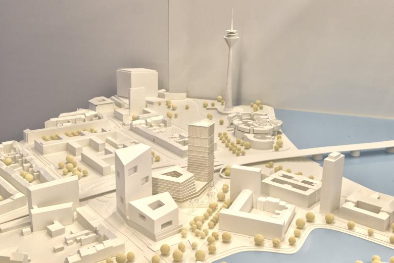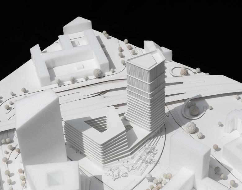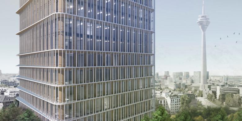 A new building for new ministries of the state of North Rhine-Westphalia and other state users will be constructed on a site near the Rhine in the center of the government district and as part of the "Blue-Green Ring". Part of the project is the first timber hybrid high-rise building in planning in Europe with a total height of over 110m.