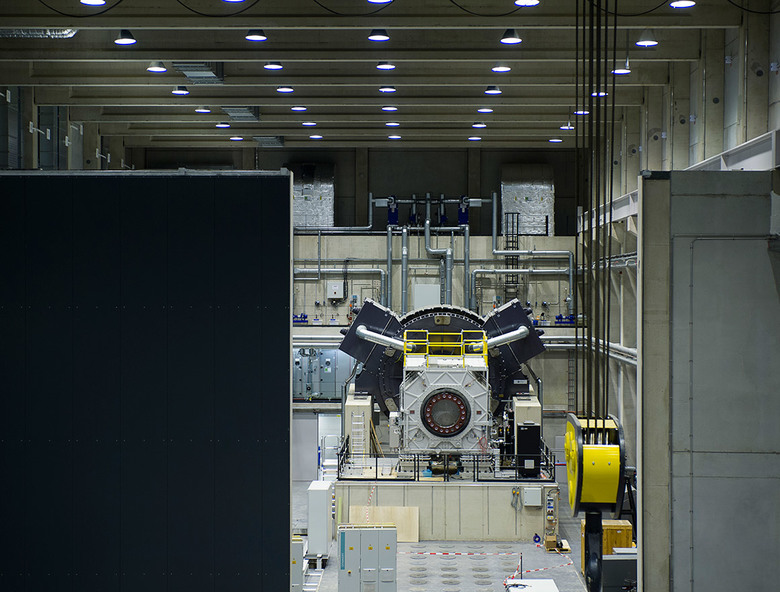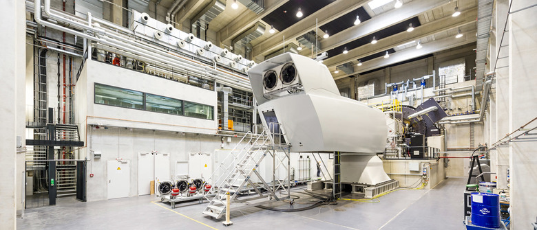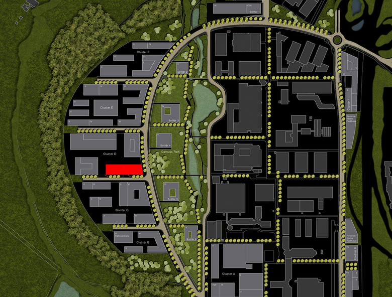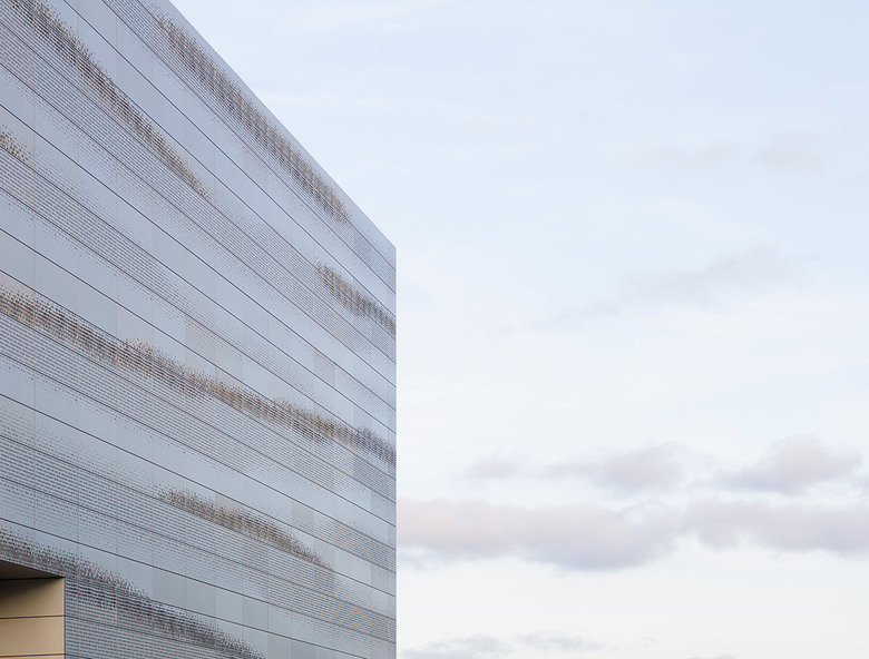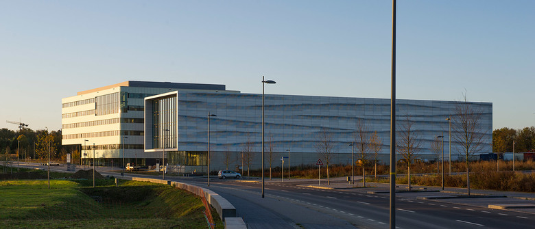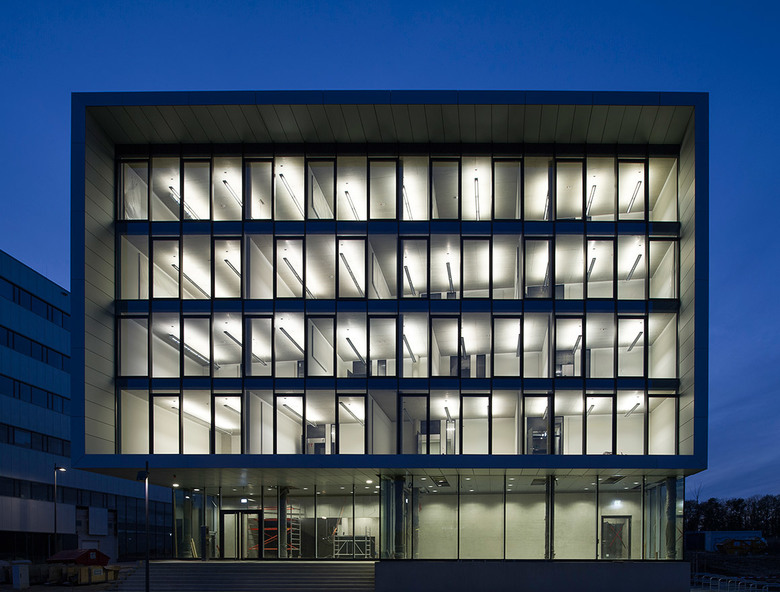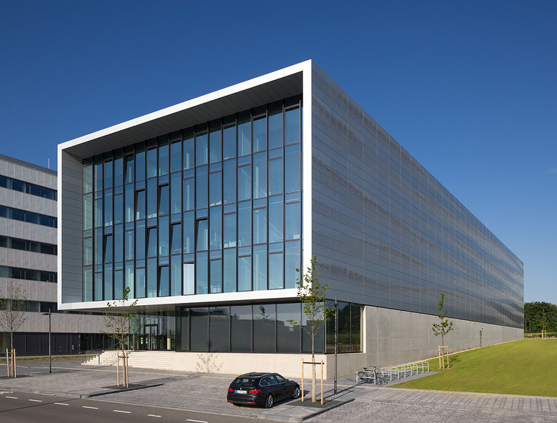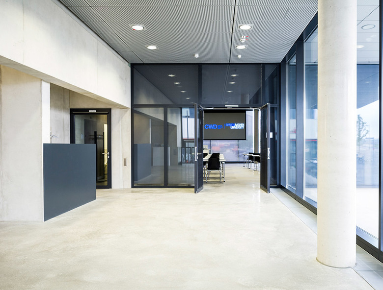 The “Center for Wind Power Drives” is a clear and simple structure that resides on the Cluster D site of the expansion of Campus Melaten of RWTH Aachen. A large portion of the plot remains not built-up and thus open for future development within this cluster. All requirements of the development plan are met with regard to plot ratio and site coverage as well as a minimum height of 18.5 metres at the boulevard. The plot layout was chosen so that deliveries by articulated or low-loader trucks are possible without accessing other premises. The shape of the structure and facade reflect the internal organization and dynamic processes of CWD. The new structure is built on a massive foundation that protrudes out of the slope situation and opens up towards the boulevard, thereby utilizing its glazed surface to extend an invitation. An apparently floating volume lays on this foundation. It is cladded with aluminium panels that, as if formed in three dimensions by wind and wind force, emphasize the dynamic shape of the structure even further. Similar to the situation on the ground floor this "membrane" opens up at the head end, thus becoming a large boulevard window. The building mainly consists of two purpose-built modules that are being constructed at different times and can react flexibly to changing requirements. A test rig with the corresponding facilities/engineering rooms and the assembly zone with storage areas and delivery zone define the hall section. A crane track spans across the entire hall. The head building comprises a buffer zone pointing towards the hall and hosting a main area and auxiliary rooms. The entrance scenario with connecting seminar rooms as well as offices and project rooms on the upper floors is oriented towards the boulevard.