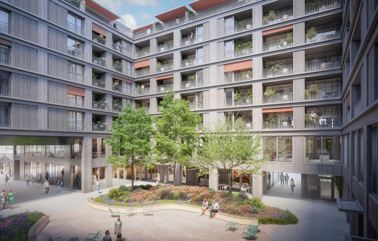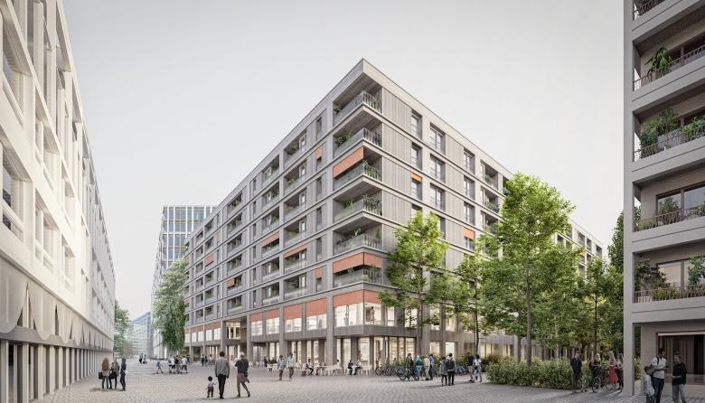 The sustainable urban neighborhood GreenCity is being built on a former industrial site under the guiding principle of the 2000-watt society. The residential form includes service and voluntary community offerings and good networking in the neighborhood.