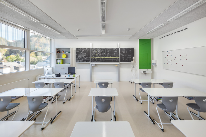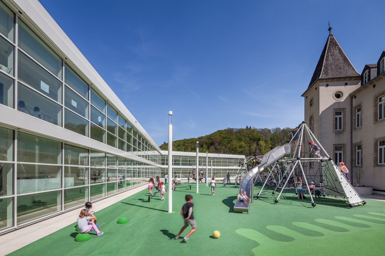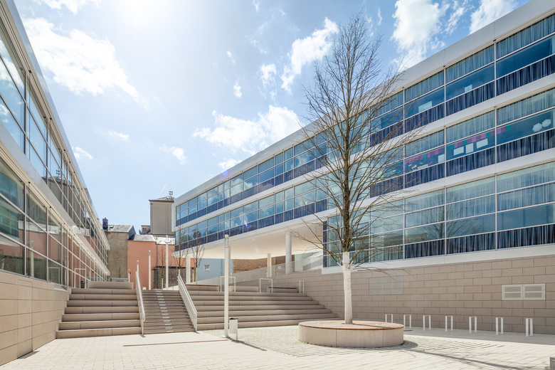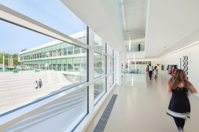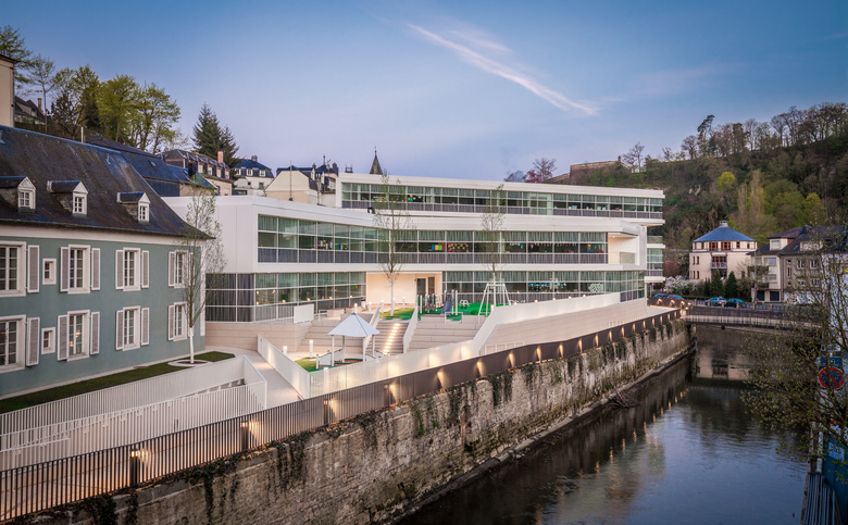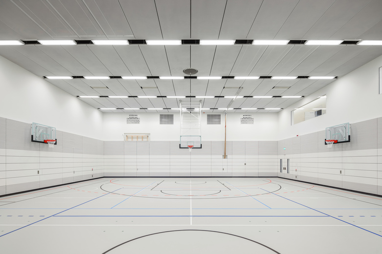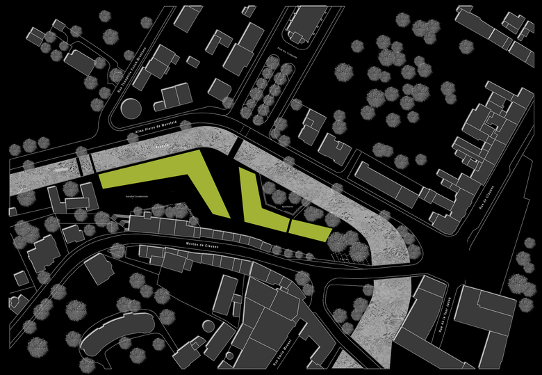An ensemble of buildings and open spaces featuring many areas that are rich in contrast and with an exciting correlation of their exterior is currently being developed on a topographically emotional site. The interaction of buildings with urban motifs such as alley, street and space allow for inspiring moments to develop. Clear structures with corresponding entrances make it easier to find your way around, and support identification with an "own" school building and corresponding school courtyard. The school buildings, which include an elementary school and kindergarten, are situated around the area in an angle, thereby leaving an open space in-between, which can be used as an entrée/address for both schools as well as the gymnasium. The buildings "clasp" around the rectangular clearance in an angle.