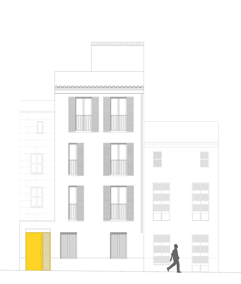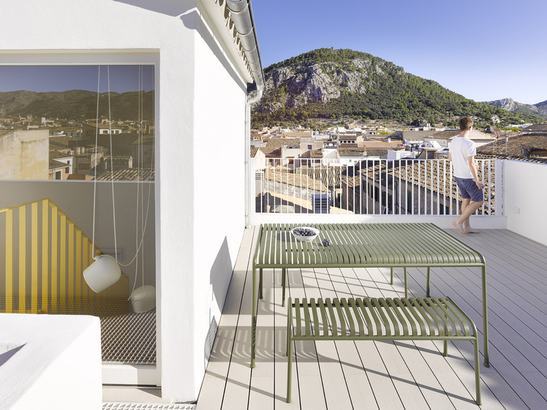 The existing beige tones and green shutters of the buildings in Carrer del Sol gave way to white for both interiors and façade. Only two elements in the house have color, the main entrance door and the stair between the kitchen and the terrace. Both mark the transition between inside and outside with a bright and welcoming yellow.