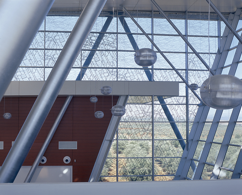 The high-speed train “AVE” station at Antequera arises like a natural part of the land, an accident on the terrain, in a place with no architectural references. The great two storey hall has two 400-metre-long platforms for high-speed trains to Madrid and Malaga and a third platform for regional trains. Technical requirements determine the length of the building, accesses to the platforms. The building is divided into four strips. Each one has its own height and curvature. The sikscreen glass treatment of the façades achieves greater control over natural light, providing a calm interior ambience.