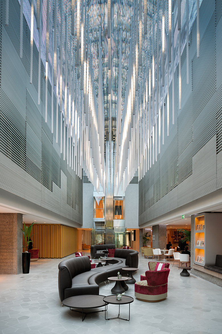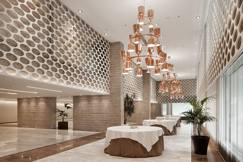 After an exhaustive study of all the possibilities available from the building's geometry, an exciting modern design was achieved, which brings greater spatial quality to the whole and integrates exclusive new services. The project is essentially a new distribution and renovation of the entrances and communal areas and the incorporation of haute cuisine restaurants. The hotel's breakfast bar has been remodelled and extended through the addition of VIP areas. The new design has also created spacious lounges for events and multi-purpose conference rooms, through the removal of intermediate slabs. These new spaces have been fitted with the very latest technology and spectacular lighting, as in the case of the ground floor lobby, where the imposing 300 m2 vaulted ceiling is equipped with a multimedia LED screen. The installations were renewed in all the remodelled areas. On the top two storeys, the 15th and 16th floors, luxury bedrooms and duplex suites were created which required certain structural interventions. The use of the very finest materials and the care taken with the finishes further reinforces the quality of the interior design.