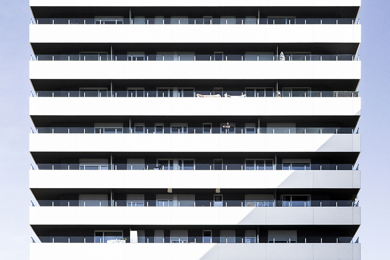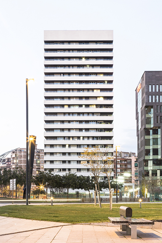 The east, south and west facades are shaped by horizontal planes that house the private terraces, while on the north facade those terraces are integrated within the perimeter of the volume.