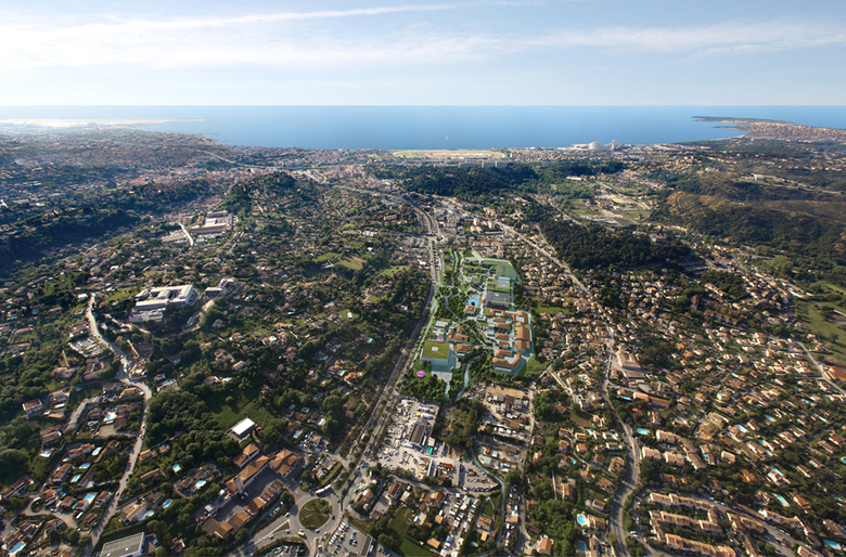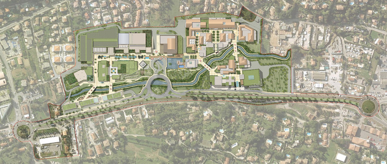 Located in the heart of the Côte d'Azur, between Nice and Cannes, this high-quality leisure and retail complex has been conceived in a Mediterranean environment – with contemporary architecture drawing on a tradition of simplicity, luminosity and Provencal colors. –It is organized like an open-air urban complex, a pedestrian village. Accessible from the city, the complex is crossed by a stream with the two banks connected by several bridges and walkways. The intervention is organized mainly on one level, with only a number of units extending to a second floor. Singular, larger buildings are located on the two extremes of the complex, focusing the circulation flows.