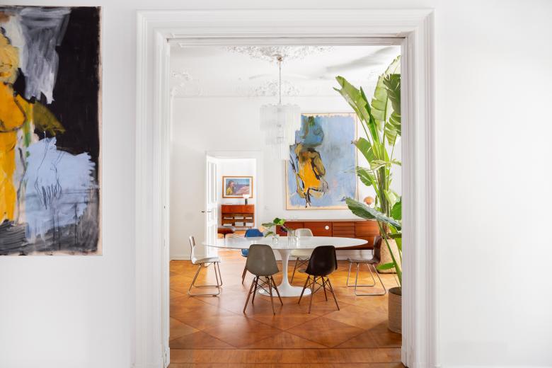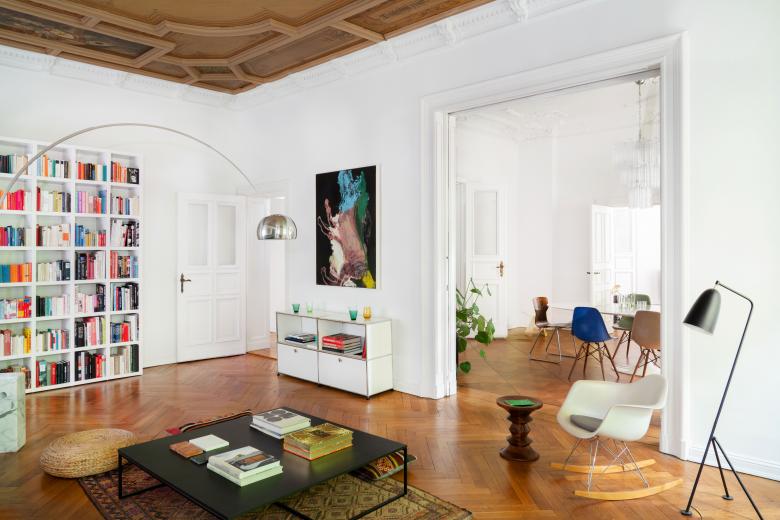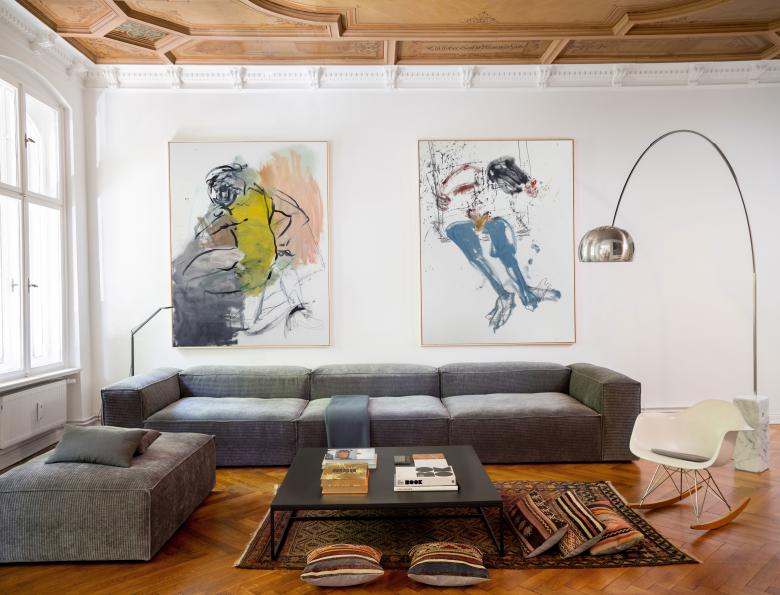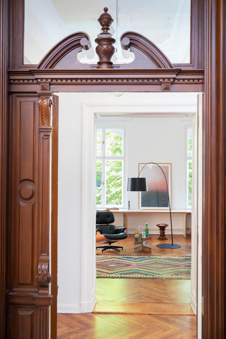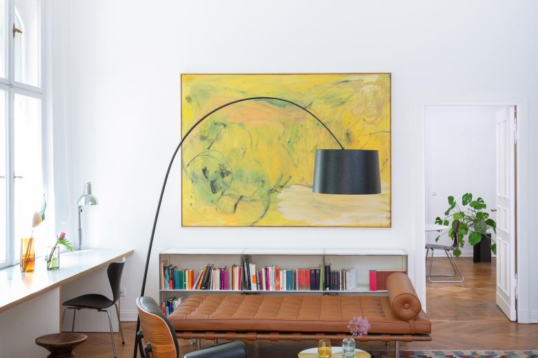 The private and exclusive gallery is located on the first floor of a listed Wilhelminian style building in Berlin Charlottenburg and offers a hybrid platform for contemporary works of art. Here, modern art is combined with an open and spacious living concept. The floor plan of the property offers exciting lines of sight inside and picturesque references to the green, the linden trees flanking the street. The art is placed in a matrix that is puristic and homely at the same time.