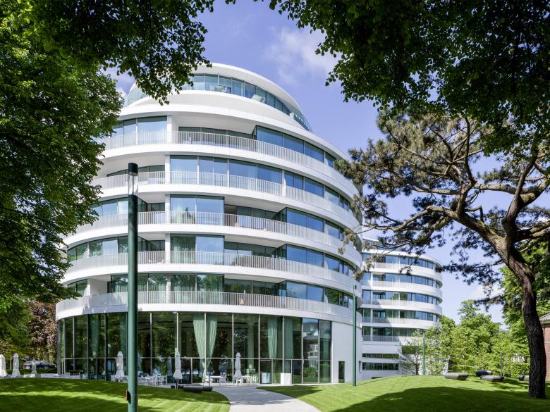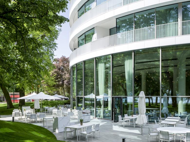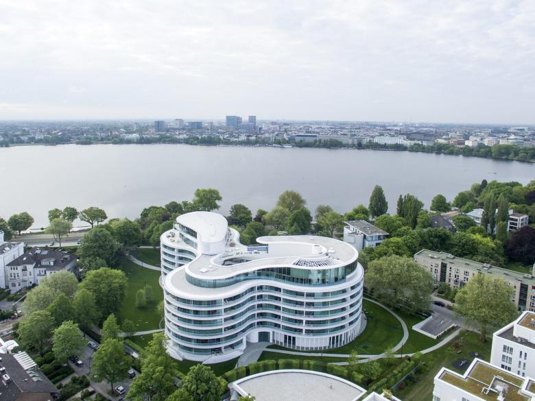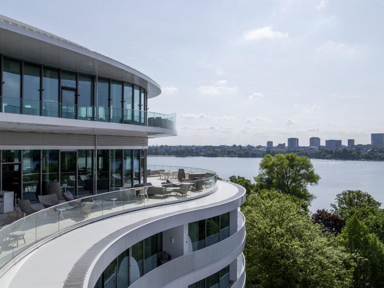 In the spirit of Hanseatic understatement, the luxury hotel "The Fontenay" in Hamburg's Rotherbaum district, right on the Inner Alster, combines stylish elegance with a surprising building shape. The architects from Störmer Murphy and Partners created a special floor plan consisting of three smooth circles and created an amorphous figure that blends smoothly into the surrounding parkland. Depending on the point of view, the concave or convex curved facade is reminiscent of light waves, while the brilliant white ceramic elements are reminiscent of an exclusive luxury yacht.