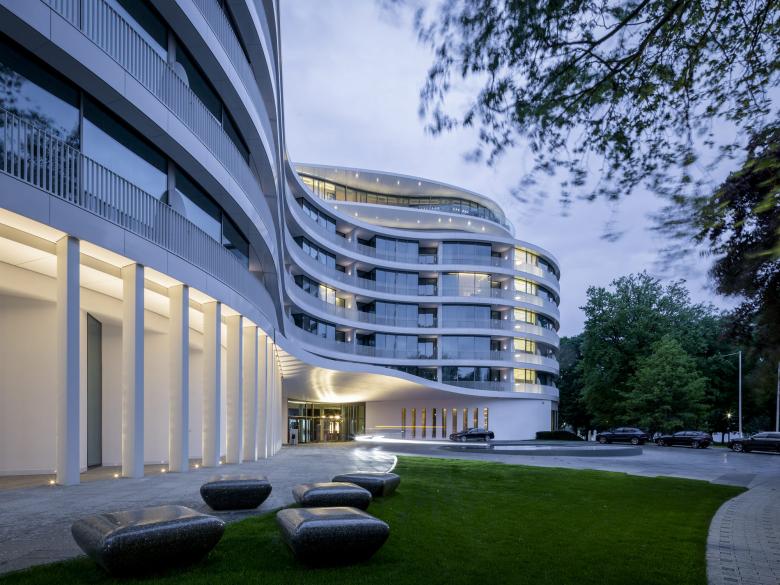 Perfect shaped elegance – The Luxury hotel The Fontenay shines in a white, sweeping ceramic facade.