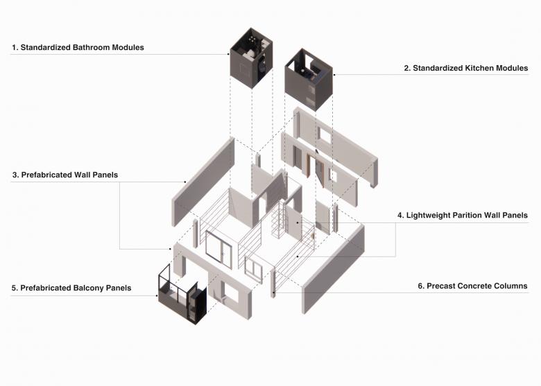 Considering a more environmentally friendly construction process, the clients requires that over 80% of the building components should be prefabricated off-site. This prefabricated method allows for a higher quality of housing production in a controlled, systematized way.
