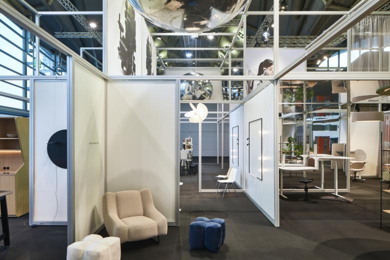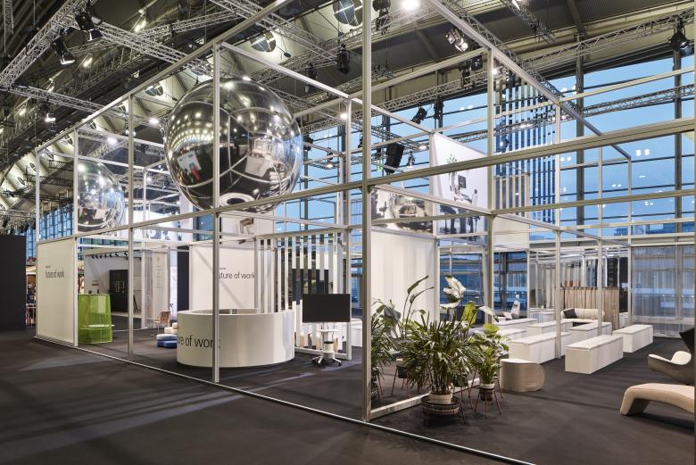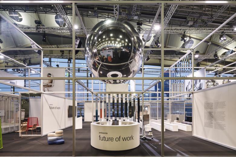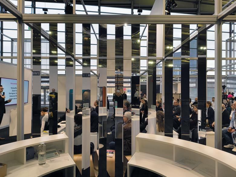 Die Gestaltung des Future-of-Work Areal verräumlicht die Herausforderungen der Orientierung in einer real-virtuellen Arbeitswirklichkeit. An einigen Stellen simulieren Dopplungen von Ausstellungsprodukten deren Realität und ihr virtuelles Abbild, an anderen Stellen vervielfältigen Spiegelstellungen ein einziges Produkt. Die Verzerrung von Wirklichkeiten wird durch Spiegelflächen thematisiert, die Flüchtigkeit virtueller Räume durch aufgelöste Wandflächen dargestellt. Insgesamt versucht