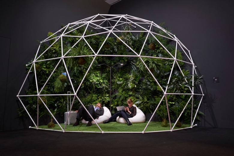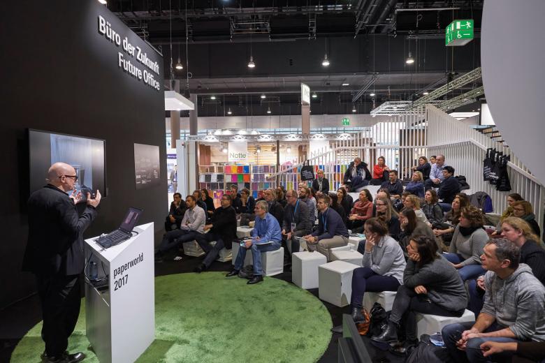 Ingredients for the Future | In the framework of the Paperworld 2017, a special exhibition on the topic "Office of the Future" was developed for Messe Frankfurt. In doing so, we were deliberately refraining from designing an office landscape, which presumed to be a representative of the future. Instead, the concept is based on the isolation of future-relevant aspects in modern offices. Direct hands-on usability was the key aspect of the design to enable visitors to have practical experience on-site.
