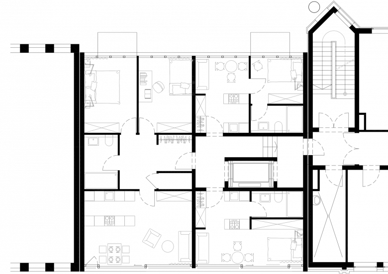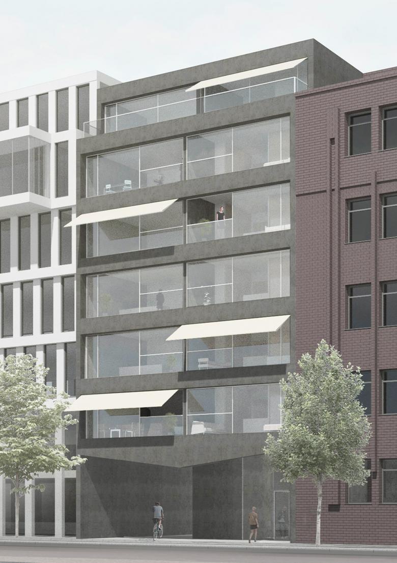 Möckernstraße 142 is located close to the center of Berlin and within walking distance of the U- and S-Bahn stations. The building, housing micro-apartments and a co-working penthouse, spans over a public passage. The horizontal structure and gray color give the house an unobtrusive but urban character.