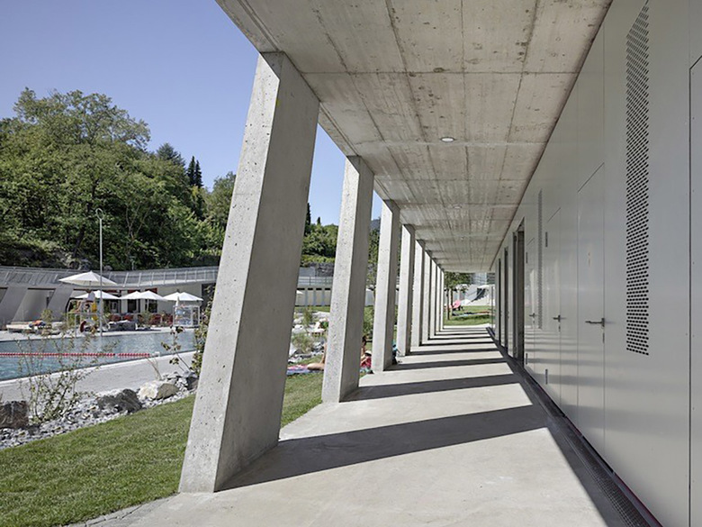 The careful restoration of this modernist facility enhances its impact. The material palette, limited to concrete, aluminum and wood, serves as a contemporary counterpart to the historical features. The pioneering spirit of modernist sport architecture informs this sustainable extension and returns the picturesque location of Géronde to the foreground.