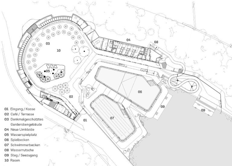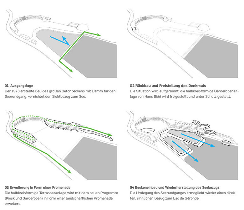 In the spirit of old postcards from the Simplon train line, the sustainable renovation of the historical Baths of Géronde complex proposes a strengthening of the connection to the lake. The original semicircular changing-room building was extended both at the entrance and on the site’s northeastern slope as a promenade along the hillside, creating a scenic addition to the existing walking trail around the lake. The terraced levels formed by these new buildings allow for the harmonious integration of the spatial program.
