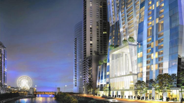 City officials in Chicago have unveiled an 88-story tower designed by Studio Gang Architects for Chinese developer Wanda Group. The zigzag tower would sit in Lakeshore East, the same development as the architect's famous Aqua Tower.