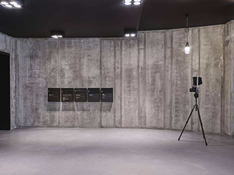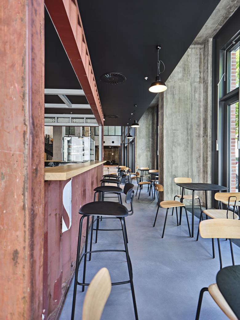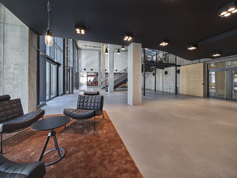 Architekturprägend ist ein zweigeschossiges Foyer mit Cafébar, welches nahezu die gesamte Breite des Gebäudes einnimmt, und über eine imposante Treppe in einen im ersten Obergeschoss verorteten Hochgarten übergeht. Schwarz-weiß Kontraste, Sichtbeton und schwarzer Stahl bestimmen die Innenarchitektur um einen Gegenpol zur Fassade zu setzten.