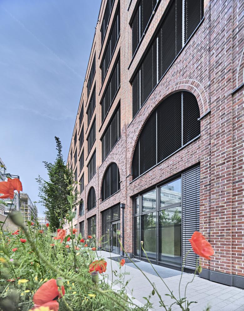 Das Bürogebäude M8 (Mühldorfstraße 8) befindet sich im Münchner Osten am Rande des dynamischen Werksviertels. Das Grundstück hat eine Größe von ca. 4.700 m² und liegt zwischen den Meisterschulen und zukünftigen Neubauten. Aufgrund der Lage in zweiter Reihe zur Friedenstraße und der gleichförmigen postmodernen Architektur im direkten Umfeld sollte der Neubau einen auffälligen Kontrapunkt im Erscheinungsbild darstellen. Das gestalterisch anspruchsvolle und maximal flexible Bürogebäude passt sich in der Höhenentwicklung den beiden Nachbarn an. Die Kubatur des Gebäudes mit Seitenlängen von 76 m, bzw. 46 m nutzt das Grundstück optimal aus. Die historisierende Fassade lehnt sich bewusst an die Gewerbearchitektur des 19.Jahrhunderts an. Die Architektur spannt den Bogen vom Industriebau über das Kontorhaus bis in die Neuzeit. Die sorgfältige Proportionierung und die feine Gliederung der Fassade verleihen dem Baukörper eine strenge Leichtigkeit. 44 Rundbögen fassen Erdgeschoss und erstes Obergeschoss und harmonieren mit der horizontalen Betonung der Regelgeschosse. Die Gestaltung mit rot-braunen Ziegeln und großen Fensterflächen interpretiert traditionelle Klinkerfassaden neu. Lisenen in jeder Achse betonen das elegante Erscheinungsbild. Nach außen wirkt das Gebäude geschlossen und introvertiert, jedoch eröffnet sich hinter den Bögen eine vollkommen neue Welt.