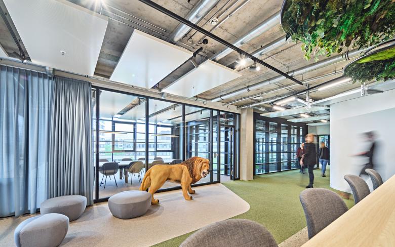 Ein grünes Band mäandert als Flur- und Kommunikationszone durch die Fläche. Weiche Kurven strukturieren den Raum, ähnlich einer Waldlandschaft mit Lichtungen, und verbinden offene und getrennte Büros. Vertikale Element zonieren den Raum in der zweiten Dimension und schaffen Rückzugsräume.